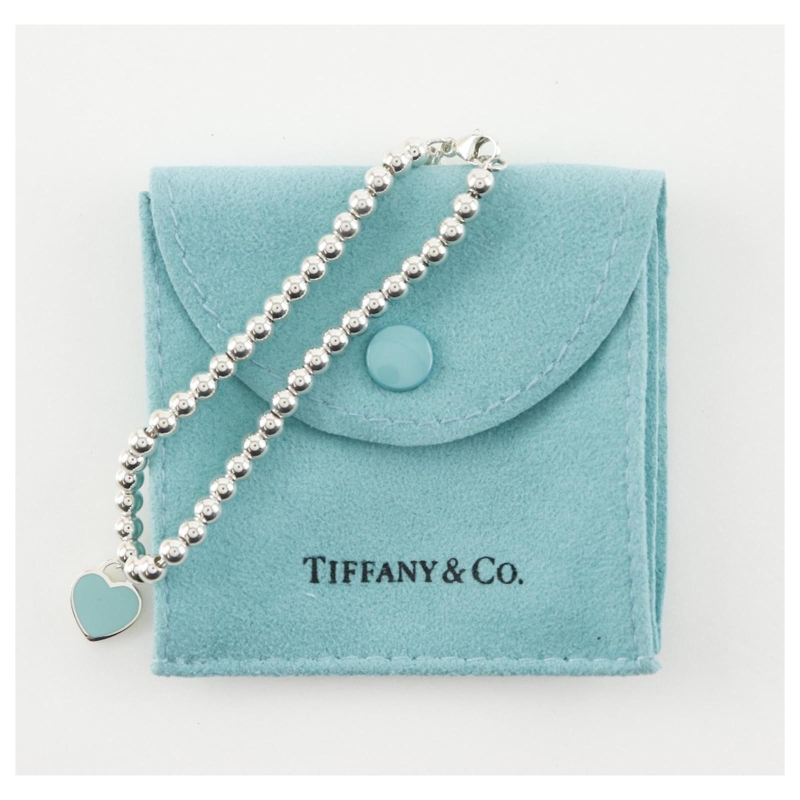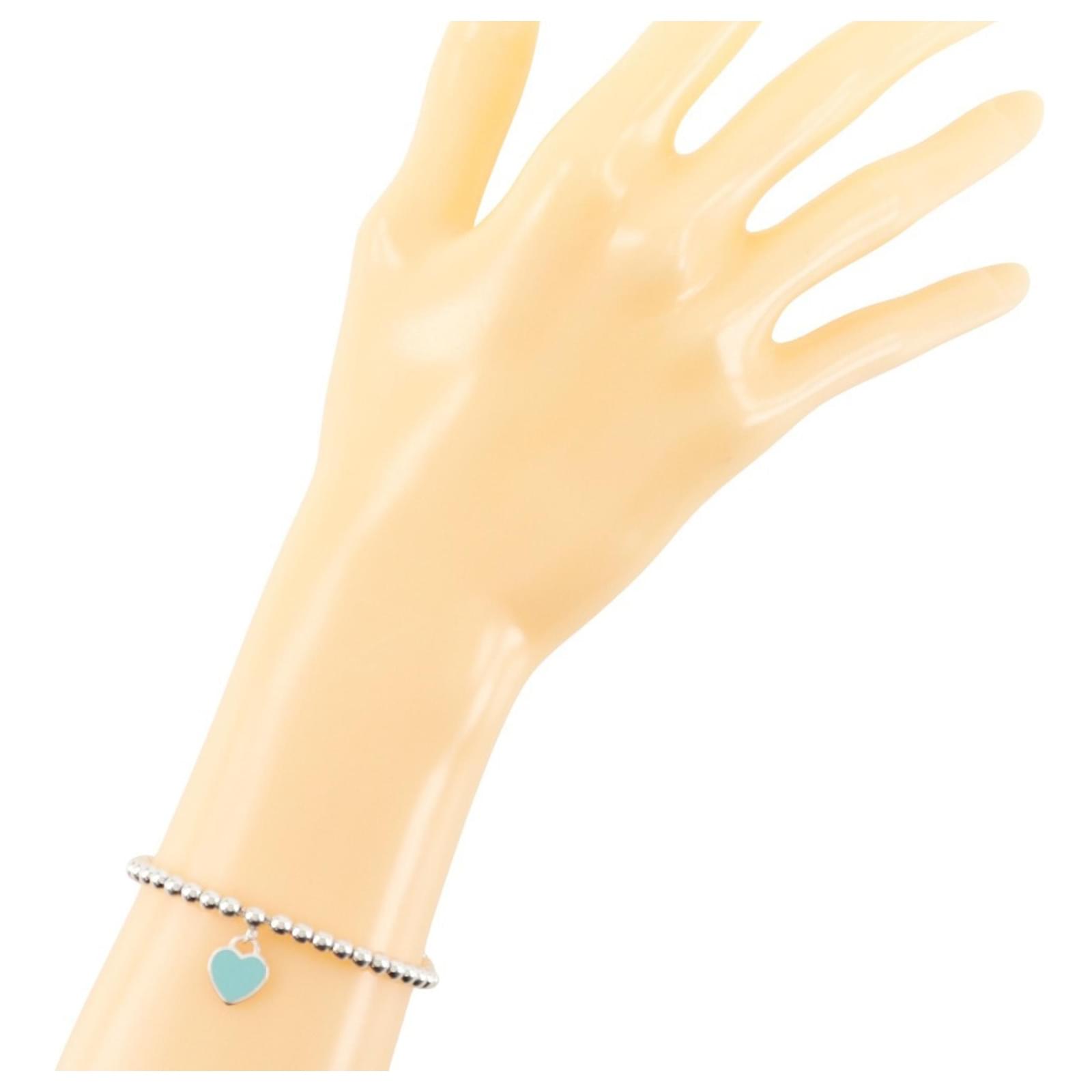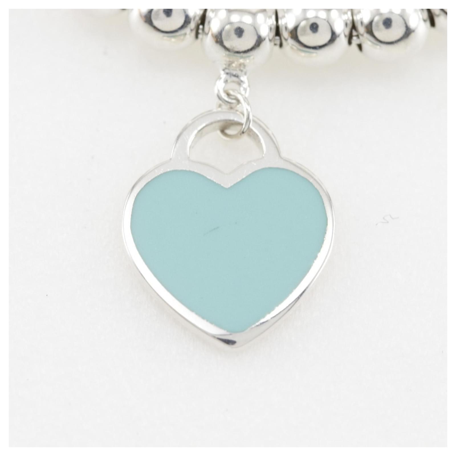 This Tiffany & Co. charm bracelet features a blue design and is crafted from Silver 925. With a length of 16.5 cm (6.49 inches), it is a stylish accessory for any occasion. The bracelet is part of the Return to Bracelet Beads Mini Heart collection and weighs approximately 5.0 grams. \n\nThe item is in used condition, classified as like new, with insignificant traces of use, scratches, and dirt. It has been polished for maintenance. Included with the bracelet is a dust bag, and potential buyers are encouraged to review the images for a detailed view of the item’s condition and included accessories.