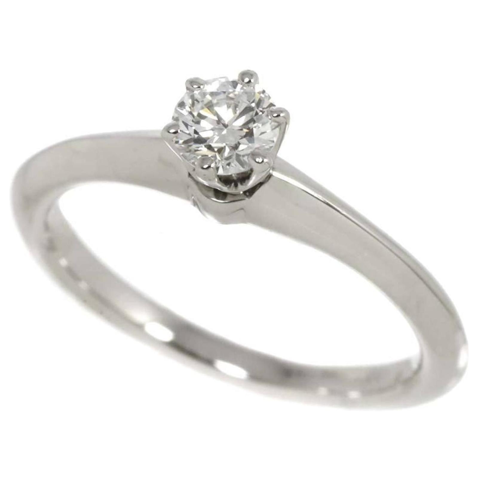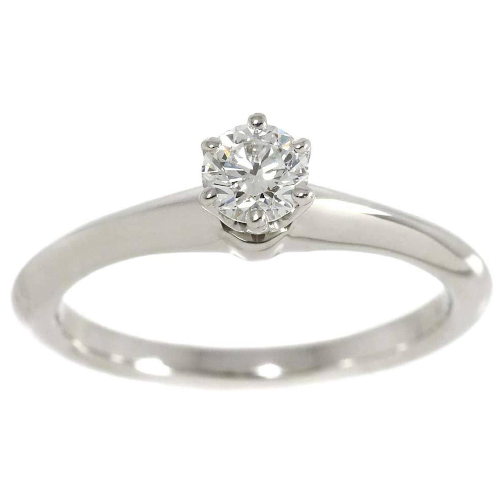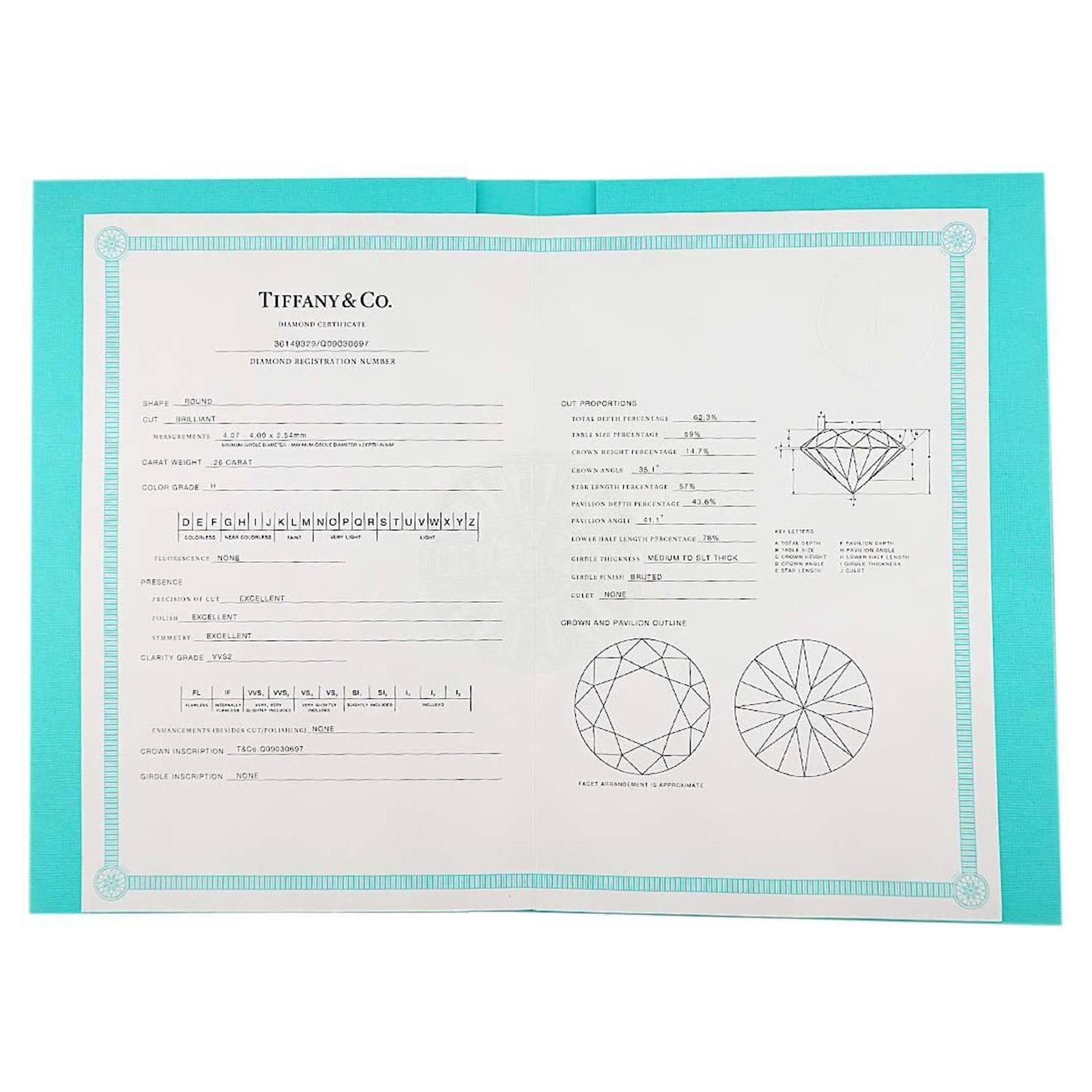 This Tiffany & Co. band ring features a solitaire diamond weighing 0.26 carats, graded H VVS2 with a 3EX cut, set in high-quality Platinum 950. The ring is available in a US size 4.5 (JP size 8) and is classified as used but in like-new condition, with insignificant traces of use, scratches, and dirt. It has been polished for maintenance. Included with the ring is a diamond grading report, and potential buyers are encouraged to review the images for a detailed view of the item and its accessories.