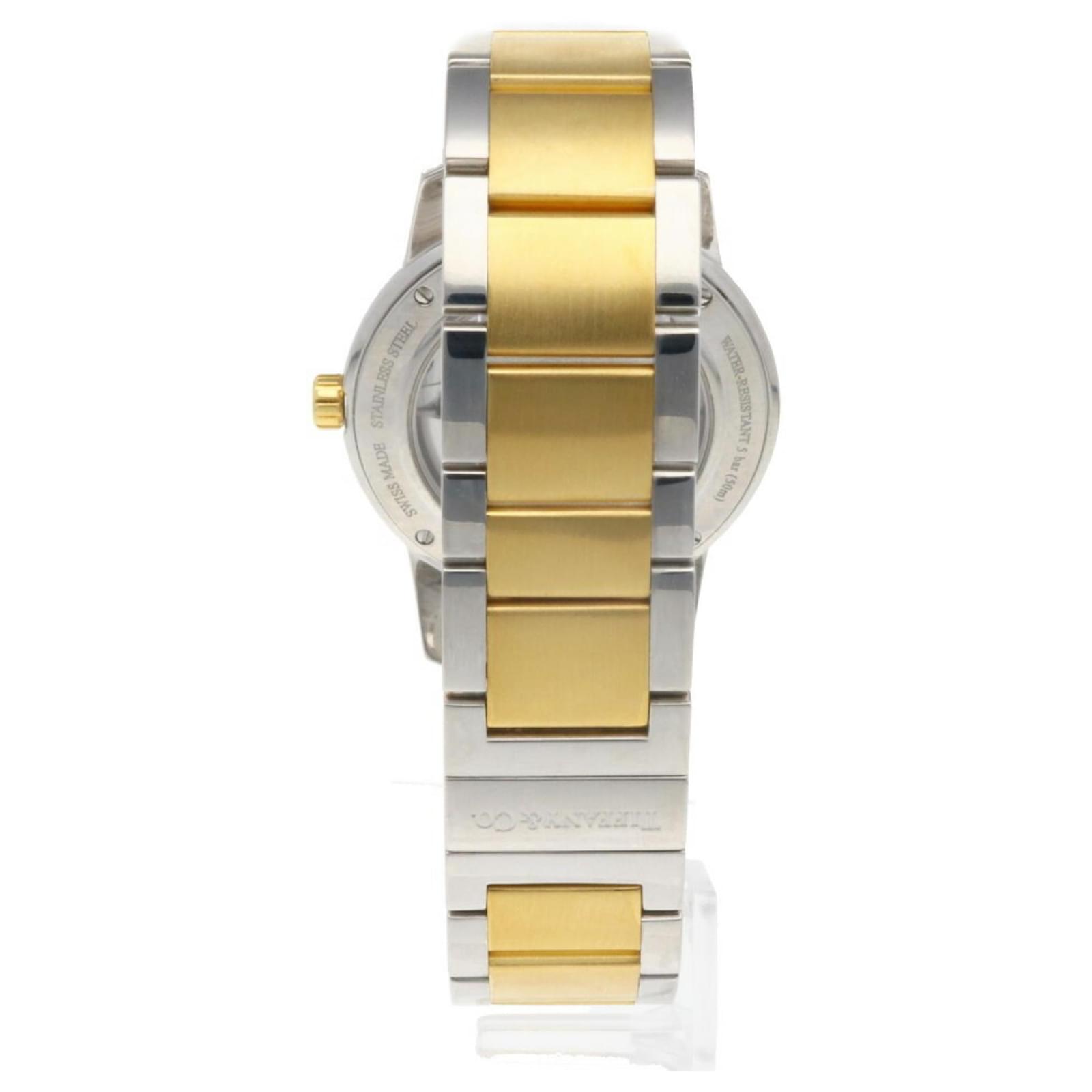 The Tiffany Atlas Dome Watch is a sophisticated timepiece crafted from stainless steel and 18K yellow gold. This automatic wristwatch features a case diameter of 37.5mm and is designed to fit a wrist size of 18.5cm (7.28 inches). \n\nThis particular model, identified as Z1800.68.15A21A00A, is pre-owned and in good condition, showing slight signs of wear such as minor scratches on the bezel, case, and bracelet. The dial and glass are largely free from significant scratches, while there is slight rust on the hands. \n\nIncluded with the watch is a guarantee card, and potential buyers are encouraged to review the provided images for a detailed view of the item’s condition.