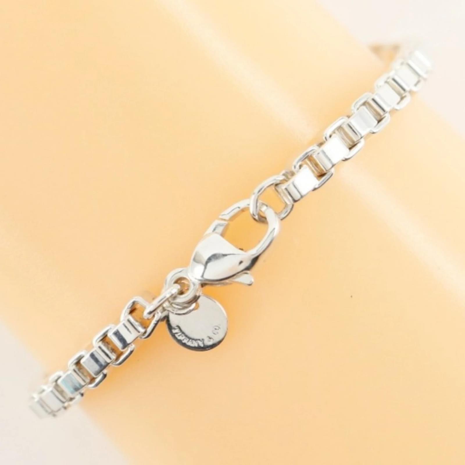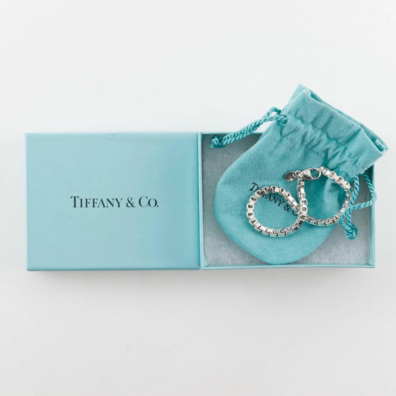 This Tiffany & Co. Venetian Charm Bracelet is crafted from 925 silver and measures 19cm (7.48 inches) in length. Weighing approximately 16.0 grams, it is designed to be unisex. The bracelet is in used condition, classified as like new, with insignificant traces of use, scratches, and dirt. It has been polished for maintenance. Included with the bracelet are a box and a dust bag. For a detailed view of the item’s condition and included accessories, please refer to the provided images.