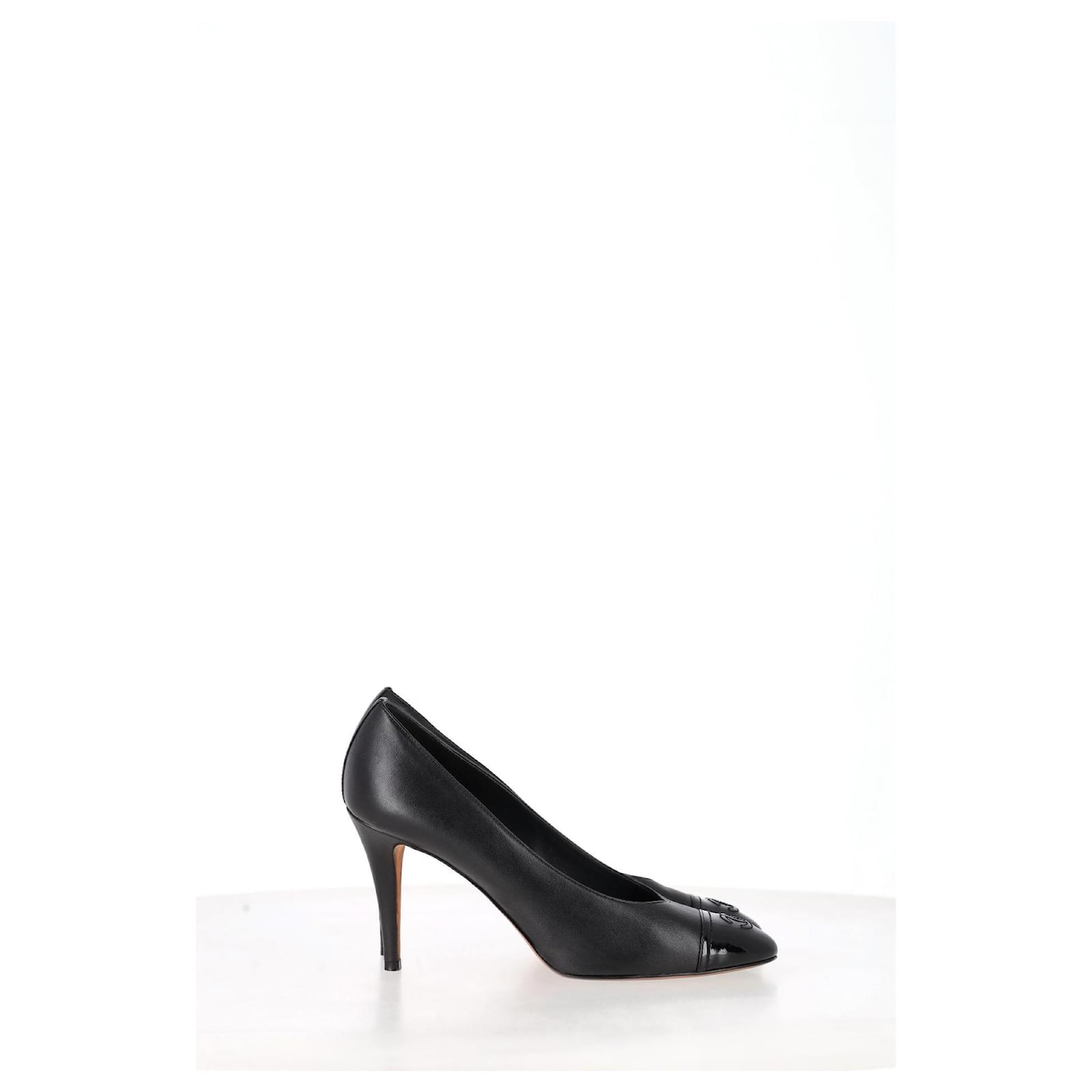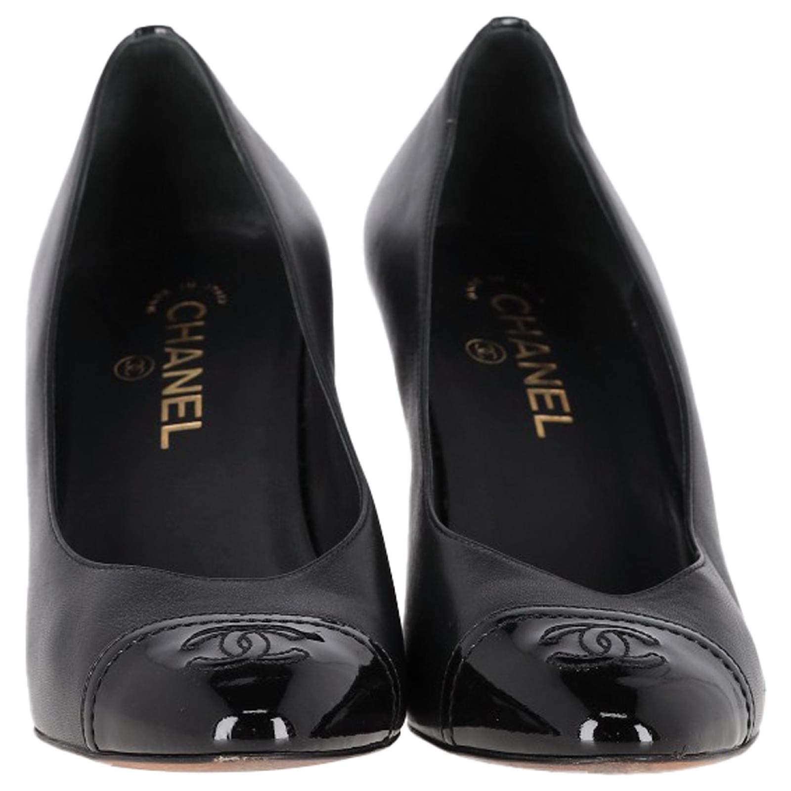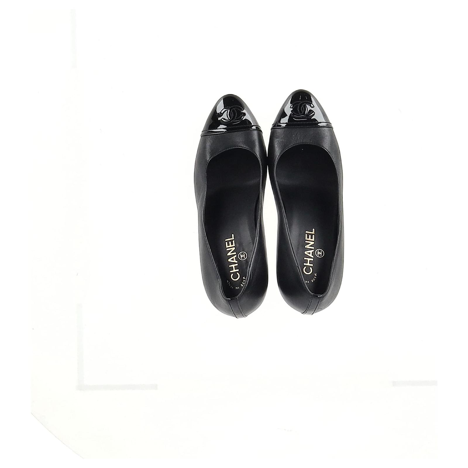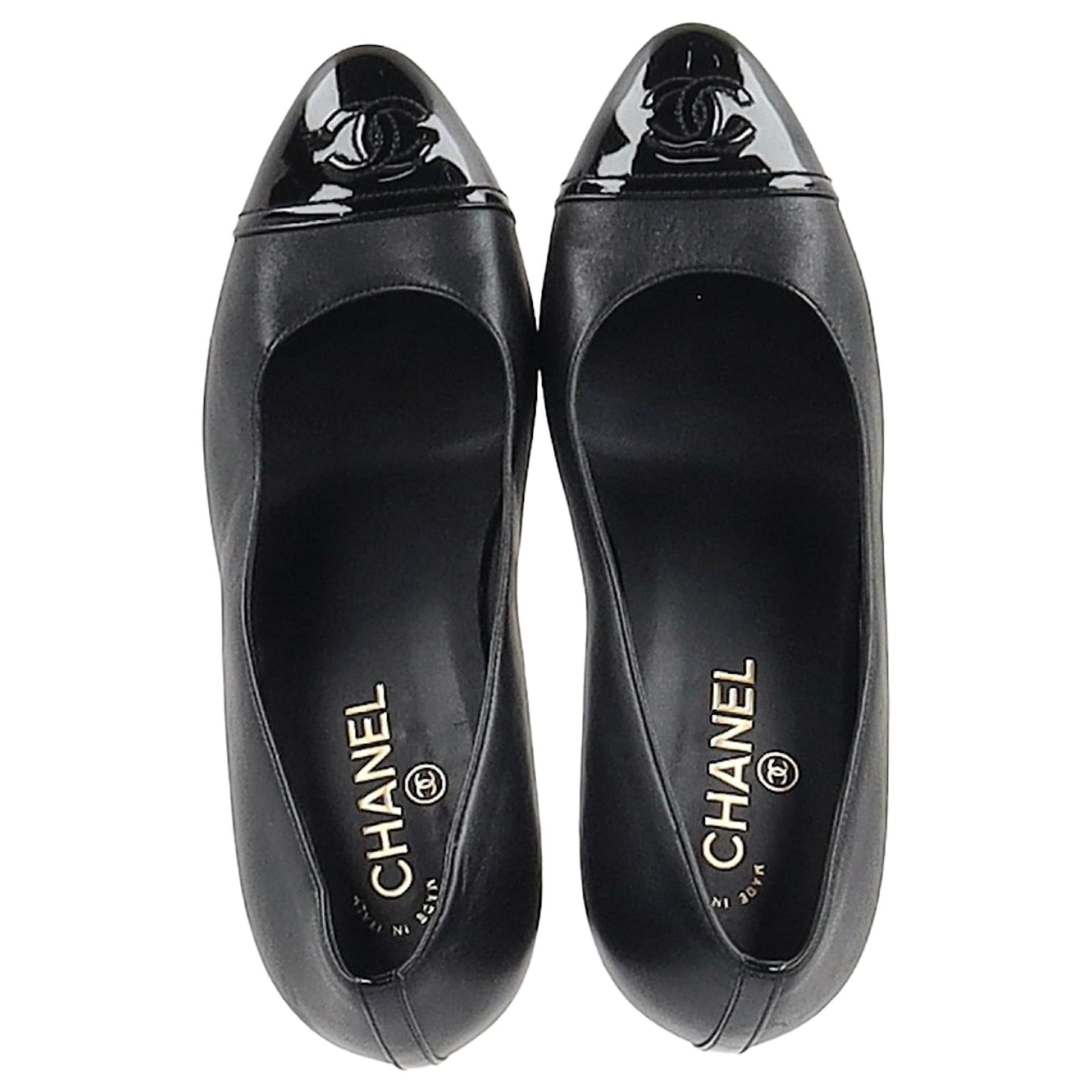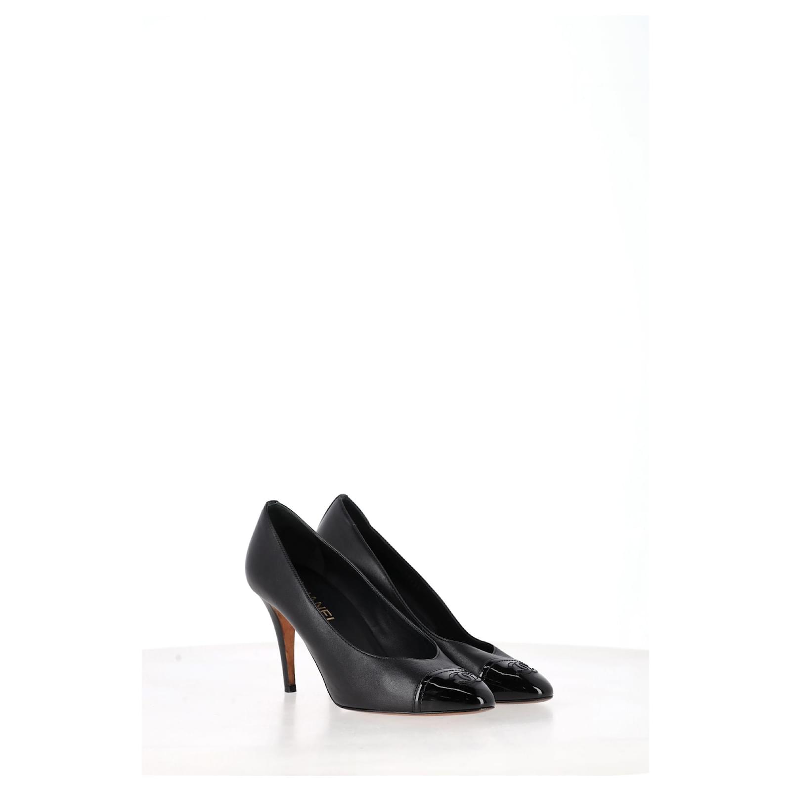 The Chanel Patent CC Cap Toe Pumps in black leather are a true icon of timeless elegance. These sleek pumps are crafted from luxurious black leather and feature a glossy patent leather cap toe, adding a touch of modern glamour to the classic design. With a comfortable 3.5-inch heel, they offer just the right amount of lift for both day and evening wear. The signature Chanel CC logo on the toe is a subtle yet unmistakable mark of luxury.\n\n\nChanel Patent CC Cap Toe Pumps in Black Leather \nCondition: good\nSigns of wear: Minor markings, Lightly used but very well maintained. Minor mark at soles & creasing, light scuffing at the soles and heels.\nPackaging: None\nColor: black\nMaterial: Leather | leather\nSize: EU | 39.5\nMeasurements: Heel height: 100; Insole length: 290\nSKU: NAPPUGBSH466054W \n Product Id: 466054 \n