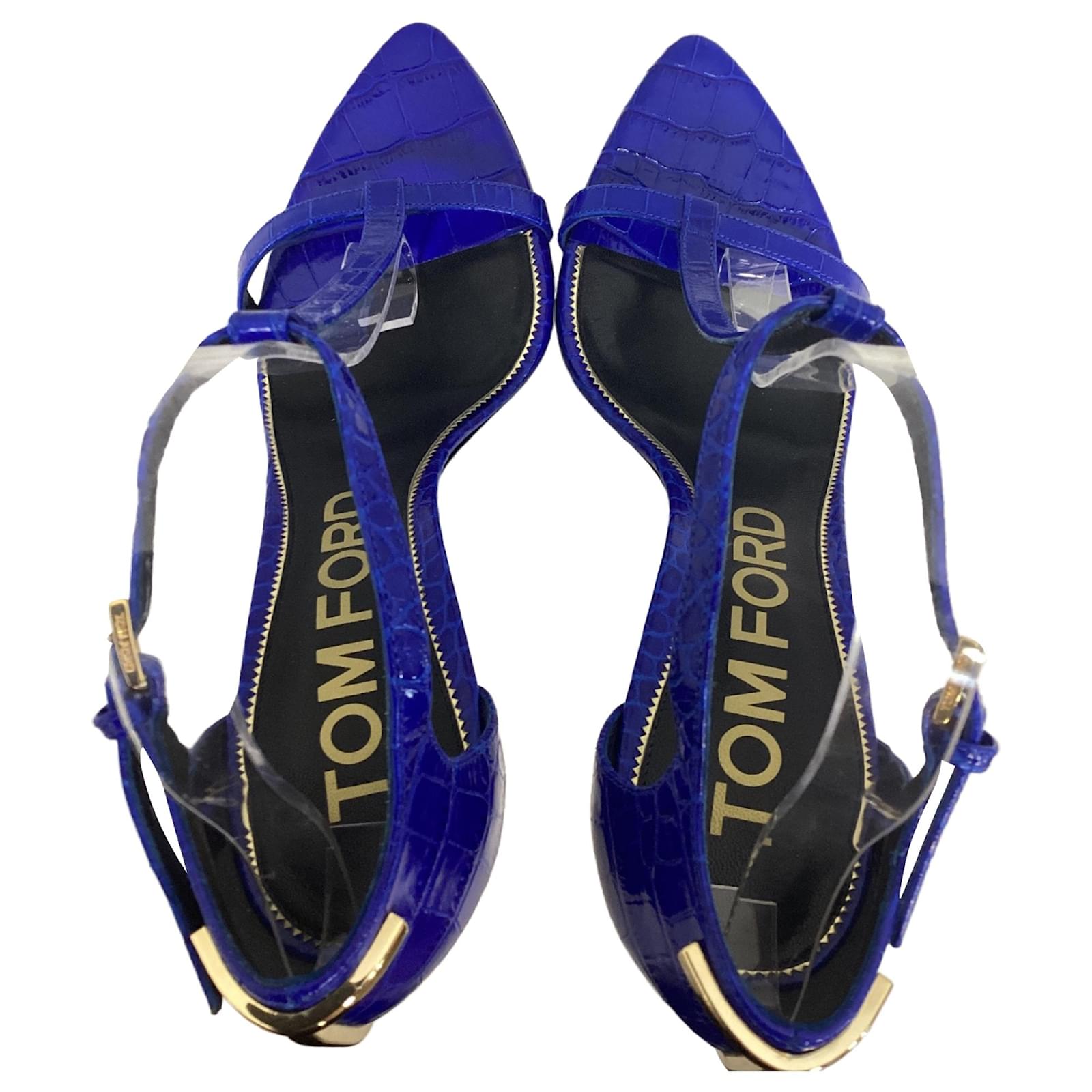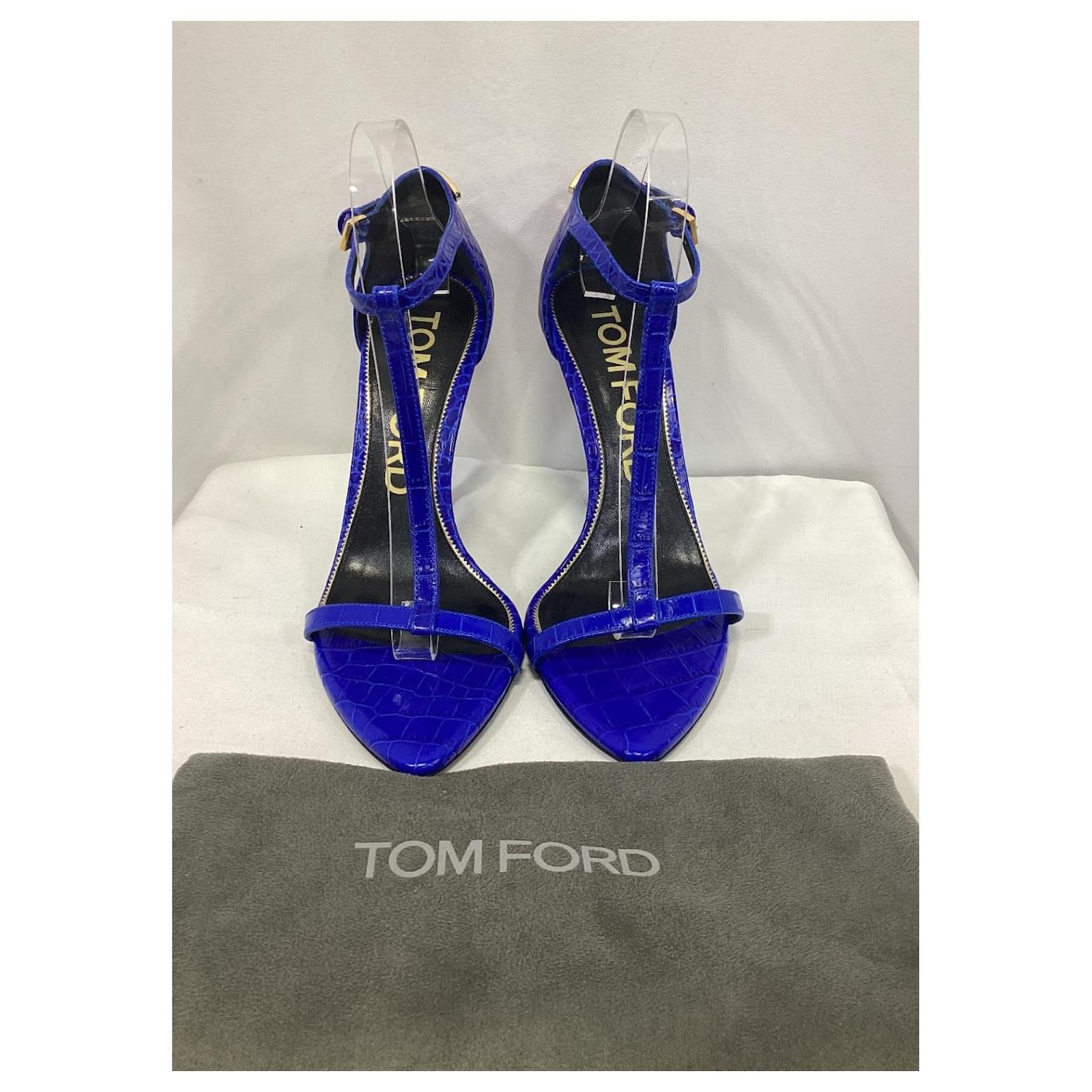 Step into fierce sophistication with the Tom Ford Iconic T Sandals, crafted in bold blue croc-embossed leather and finished with striking gold-tone hardware. Made in Italy, these heels feature a pointed toe, ankle buckle closure, and a razor-sharp 105mm stiletto—all grounded by a smooth leather sole and rubber-tap heel for sleek durability. These sandals redefine power dressing with unapologetic polish and attitude.\n\n\nTom Ford Croc Iconic T Sandals in Blue Leather\nCondition: Excellent\nSigns of wear: No visible sign of wear. No Mark at insole., Unused or used once, but as good as new. Very light mark at soles.\nPackaging: Dust bag\nColor: Blue | blue\nMaterial: Leather | leather\nSize: IT | 40.5\nMeasurements: Heel height: 120mm; Insole length: 255mm\nSKU: NAPPUUSSH492167W \n Product Id: 492167 \n