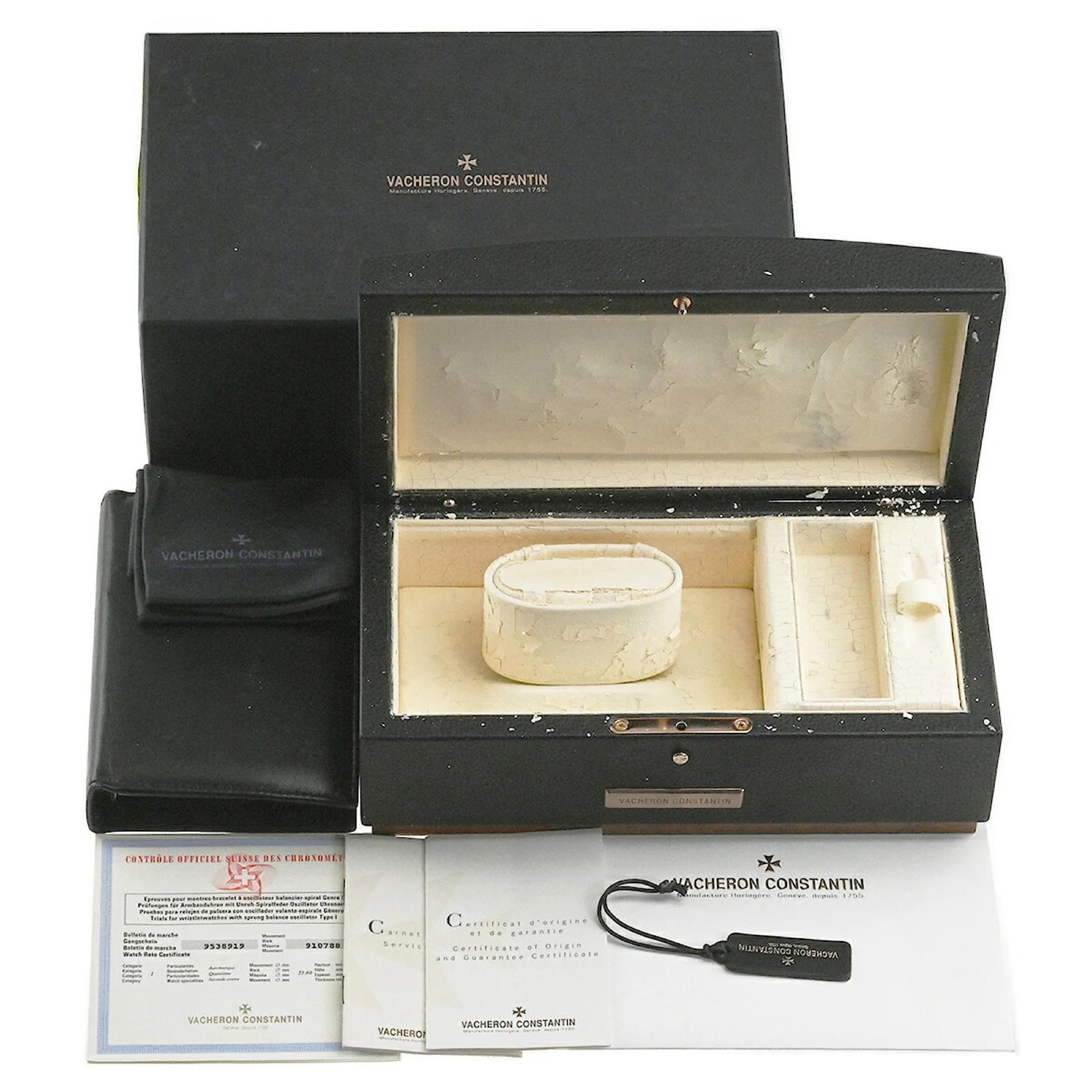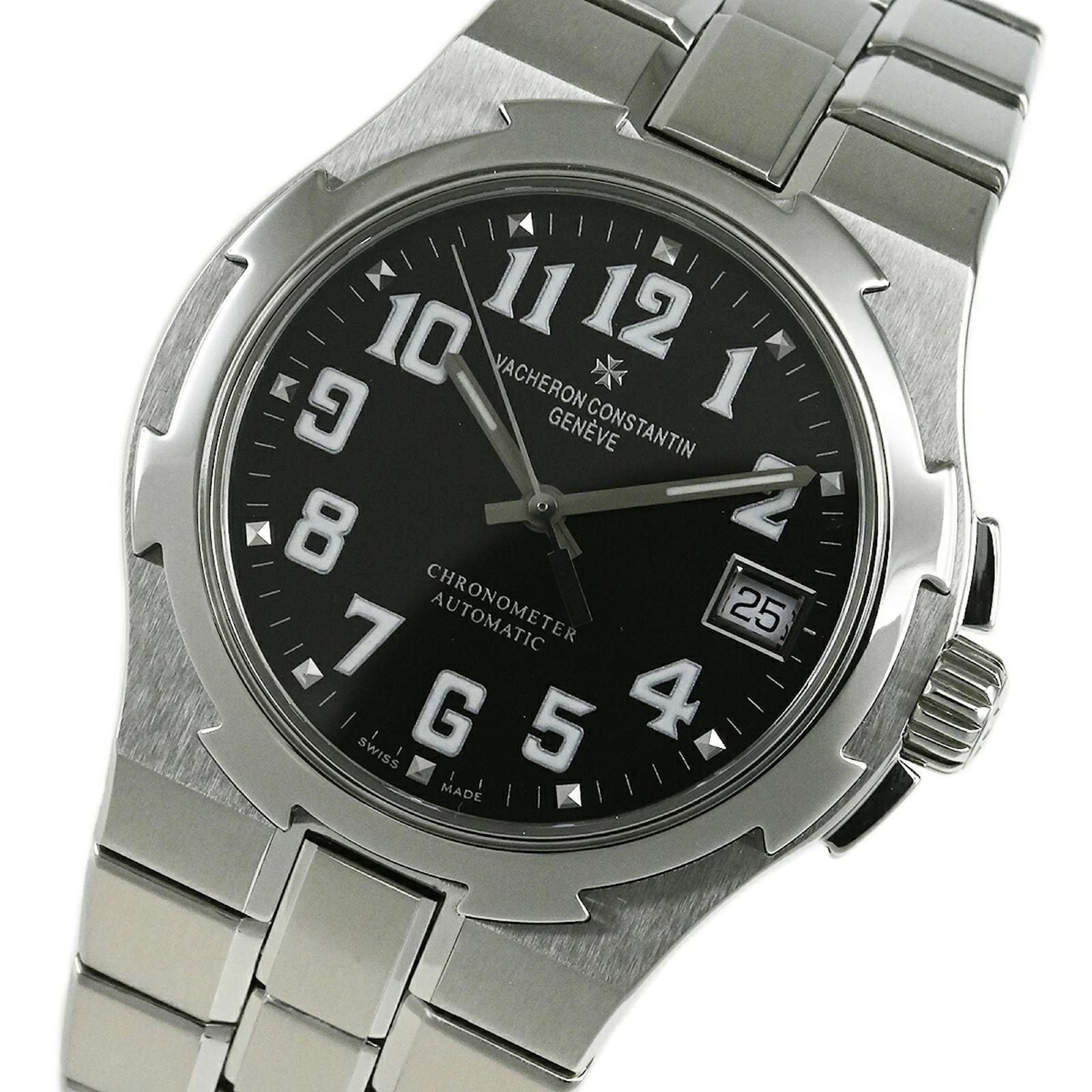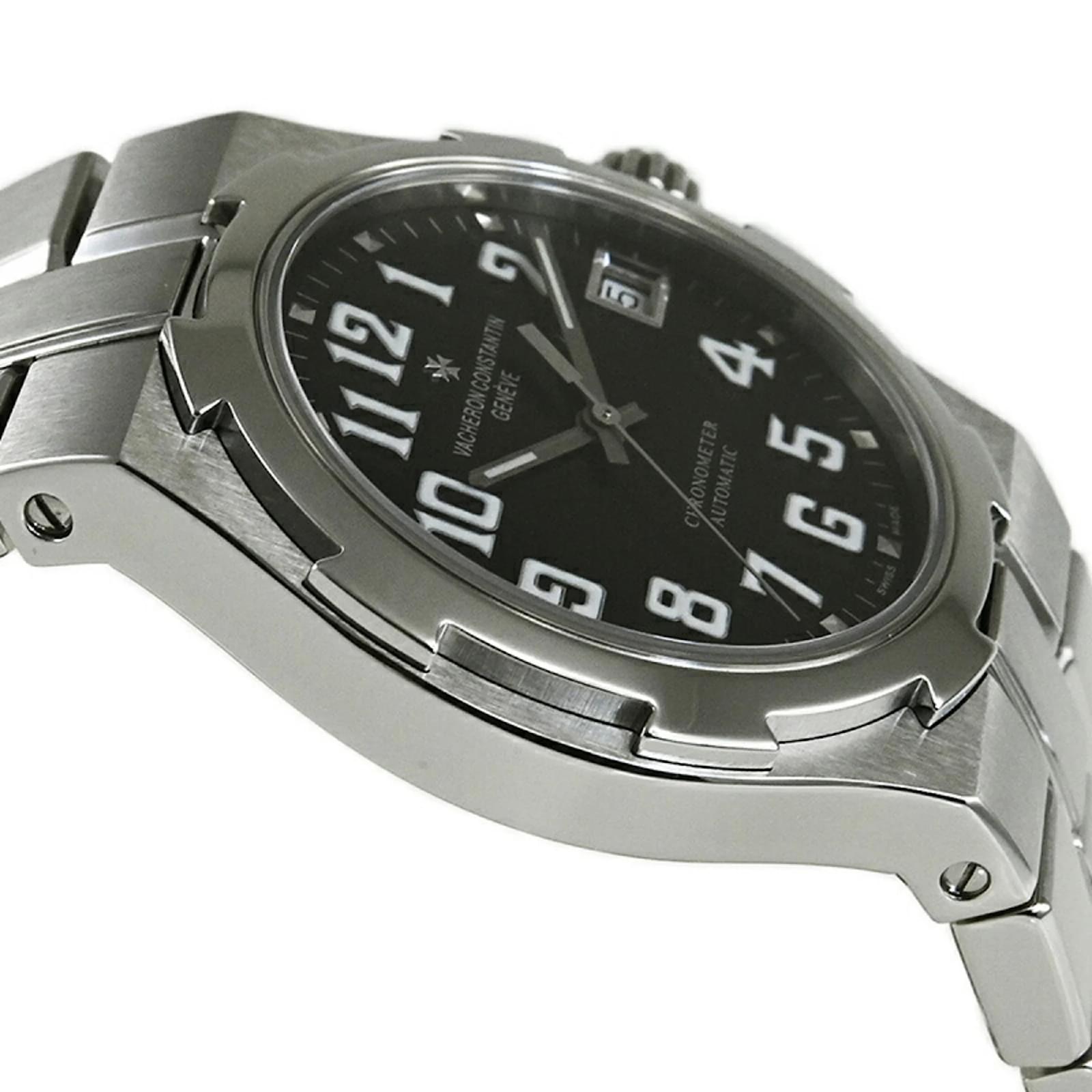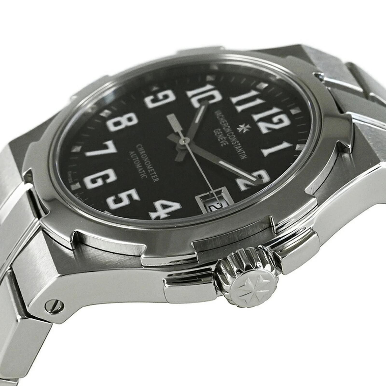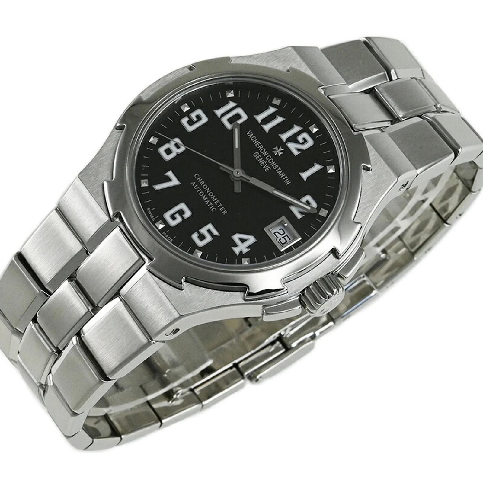 The Vacheron Constantin Overseas Large Watch, model 42042/423A-8890, features a sleek black dial protected by scratch-resistant sapphire crystal. This luxury sport wristwatch is crafted from stainless steel, both in the case and the band, and showcases an analog display. It operates on a self-winding automatic movement and is water-resistant up to 15 meters. \n\nWith a case diameter of 37mm and a thickness of 8.5mm, it fits a wrist size of 19cm (7.48 inches). The watch is classified as used but remains in good condition, showing insignificant traces of wear such as minor scratches on the bezel and case. Included with the watch are a booklet, certificate, and both inner and outer boxes. \n\nThis timepiece is a product of Switzerland, reflecting the brand’s commitment to quality and craftsmanship. Before purchasing, potential buyers are encouraged to review the images for a detailed view of the watch’s condition and included accessories.