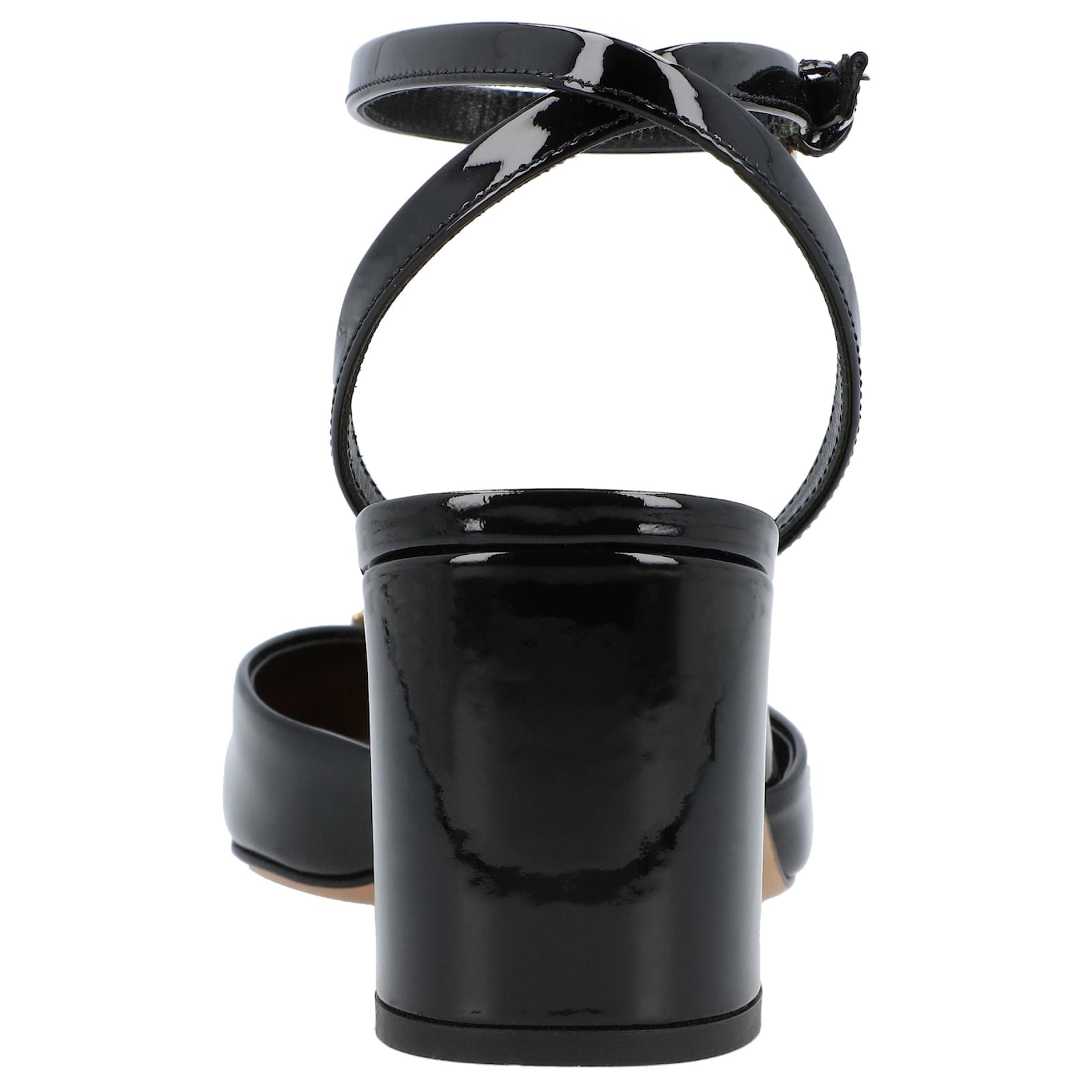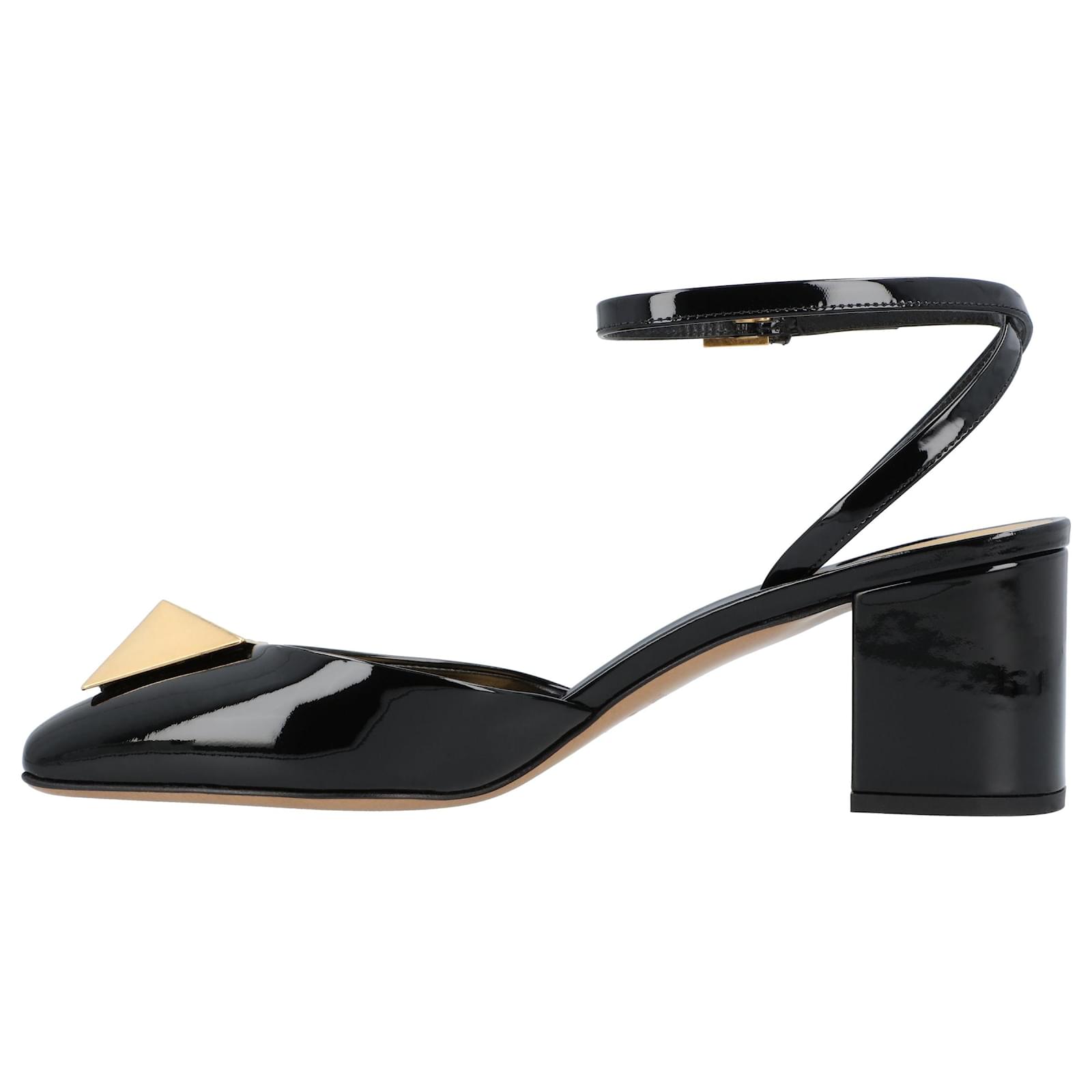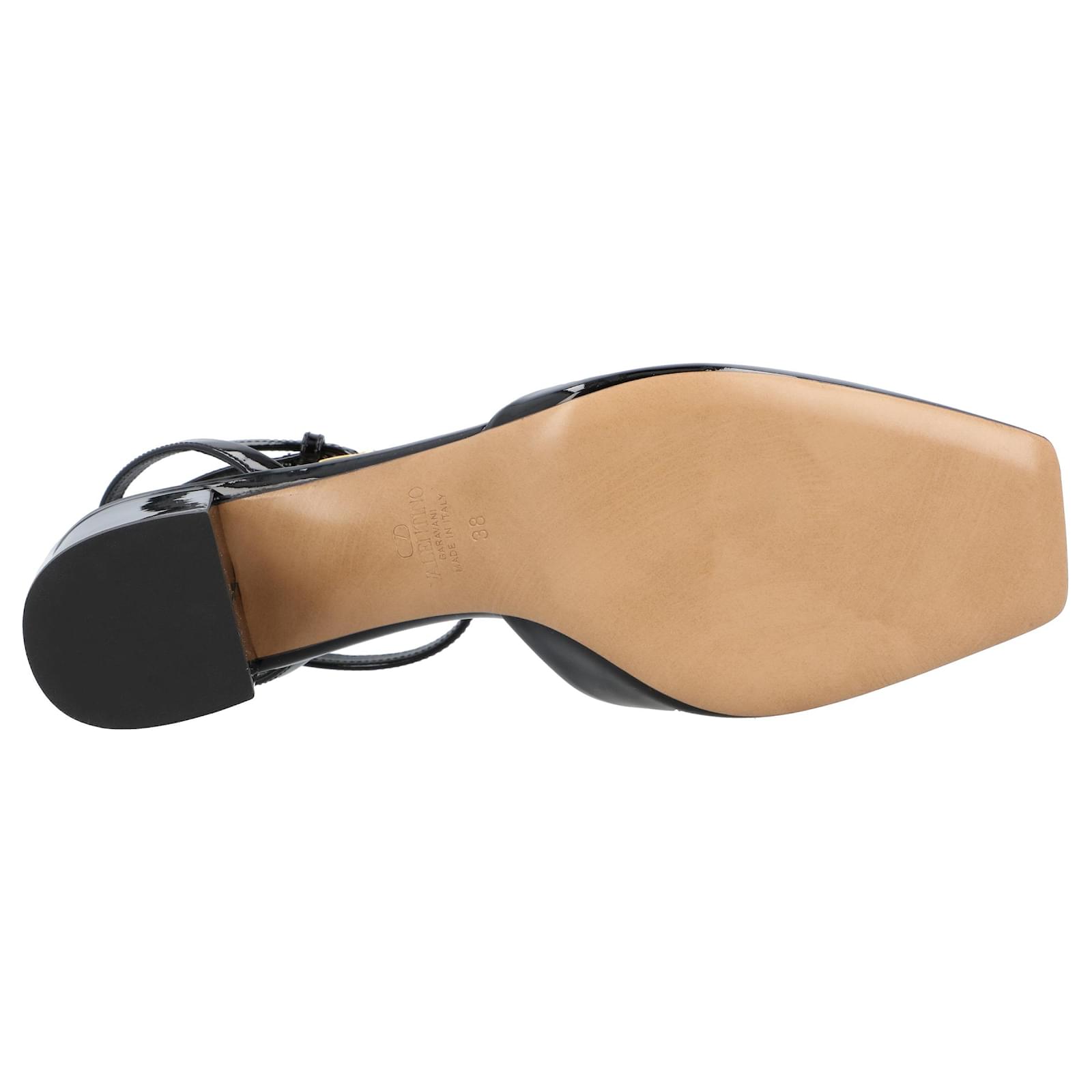 patent leather\n \n\n Classic Roman stud detail.\n \n\n square tip\n \n\n Buckle strap closure at ankle\n \n\n leather insole with logo\n \n\n Exterior: 100% calfskin, 100% metal\n \n\n Sole: 100% calfskin\n \n\n Lining: 100% goatskin \n Product Id: 495686 \n