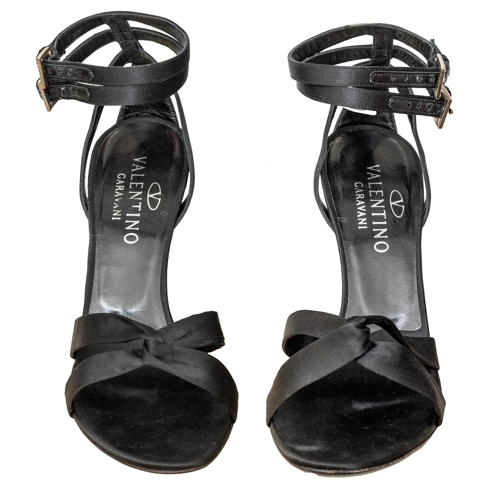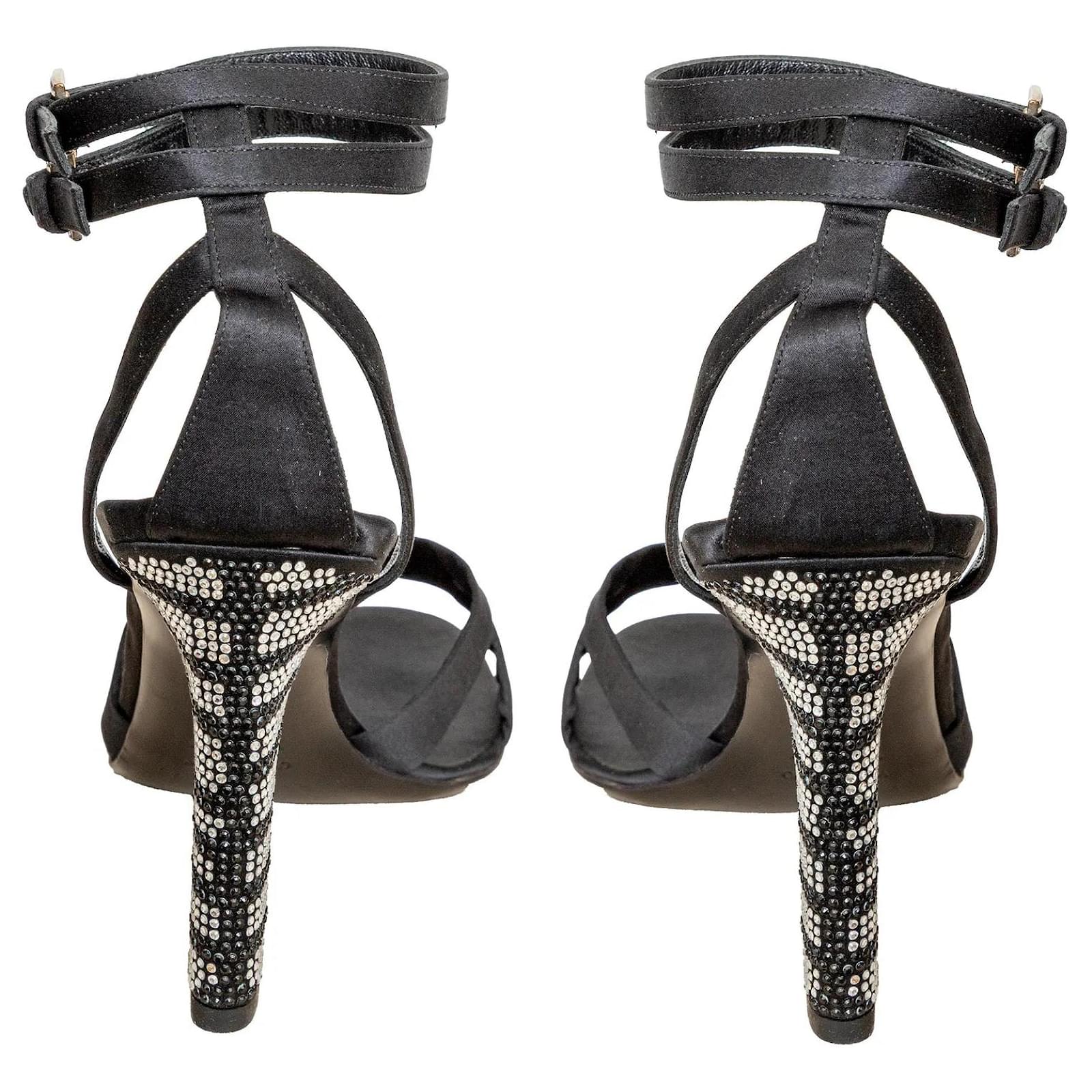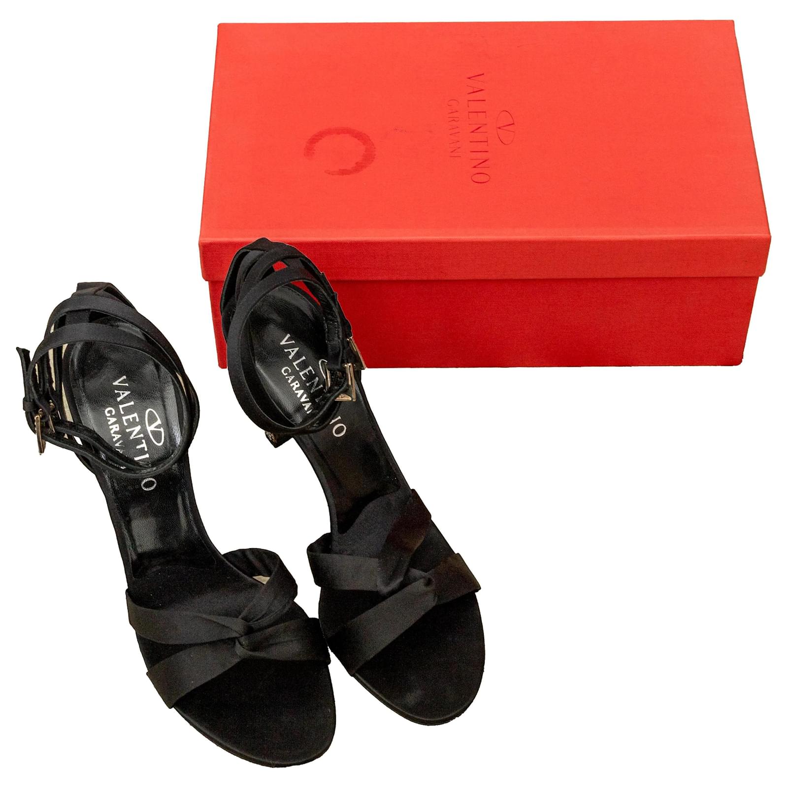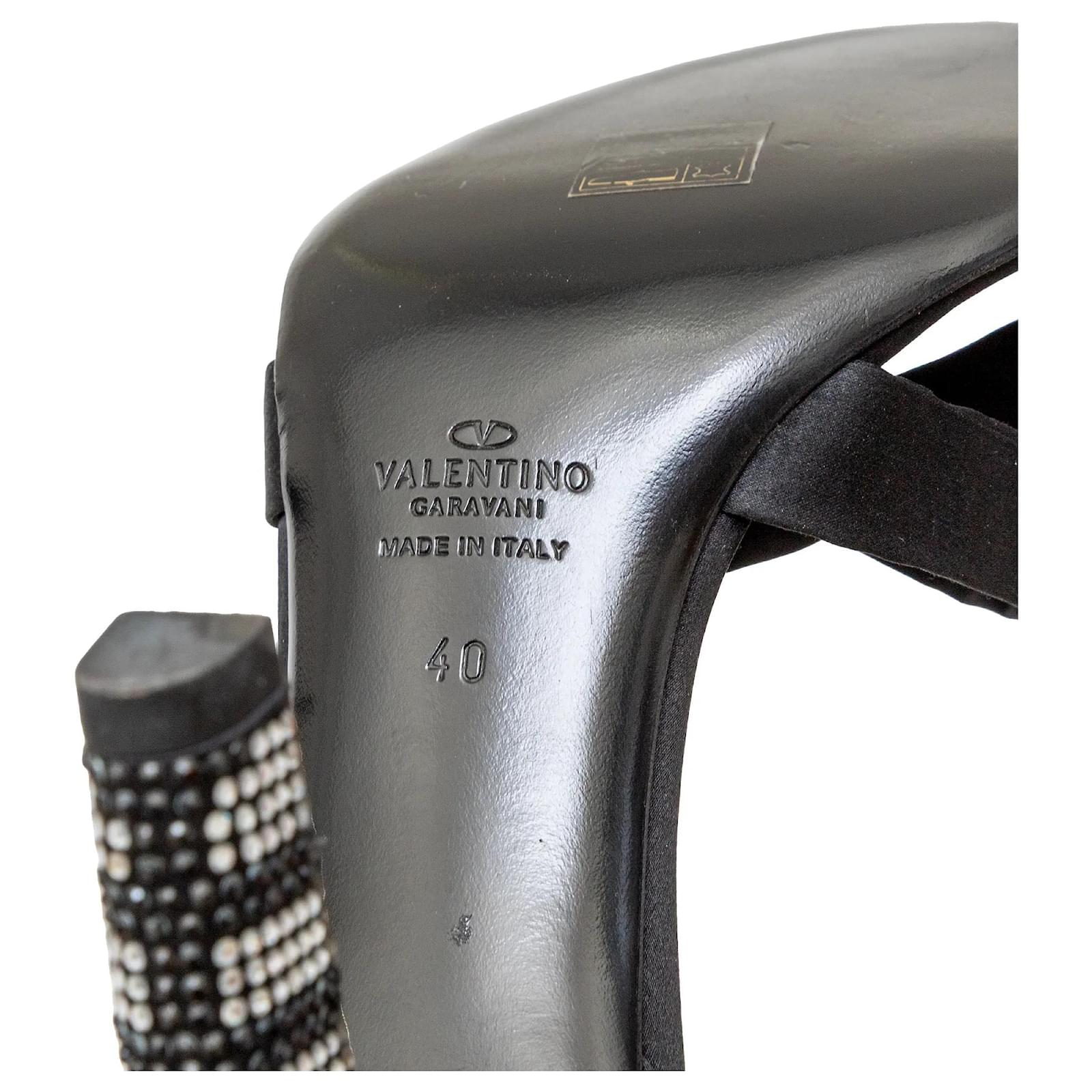 Valentino heels in black satin with double strapped ankle, twisted fabric upper, and crystal-embellished heels for a sparkling finish.\n\nInclusion: box. \n\nInsole Length:26\nHeel:10\nFabric | Leather