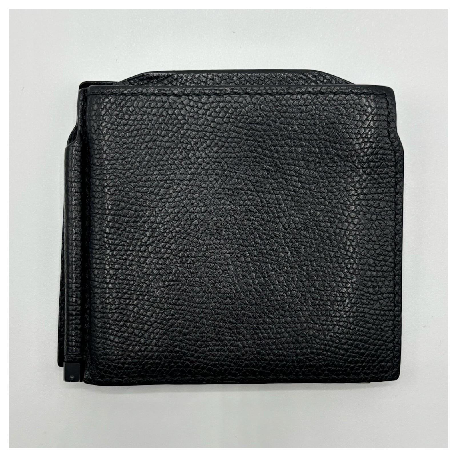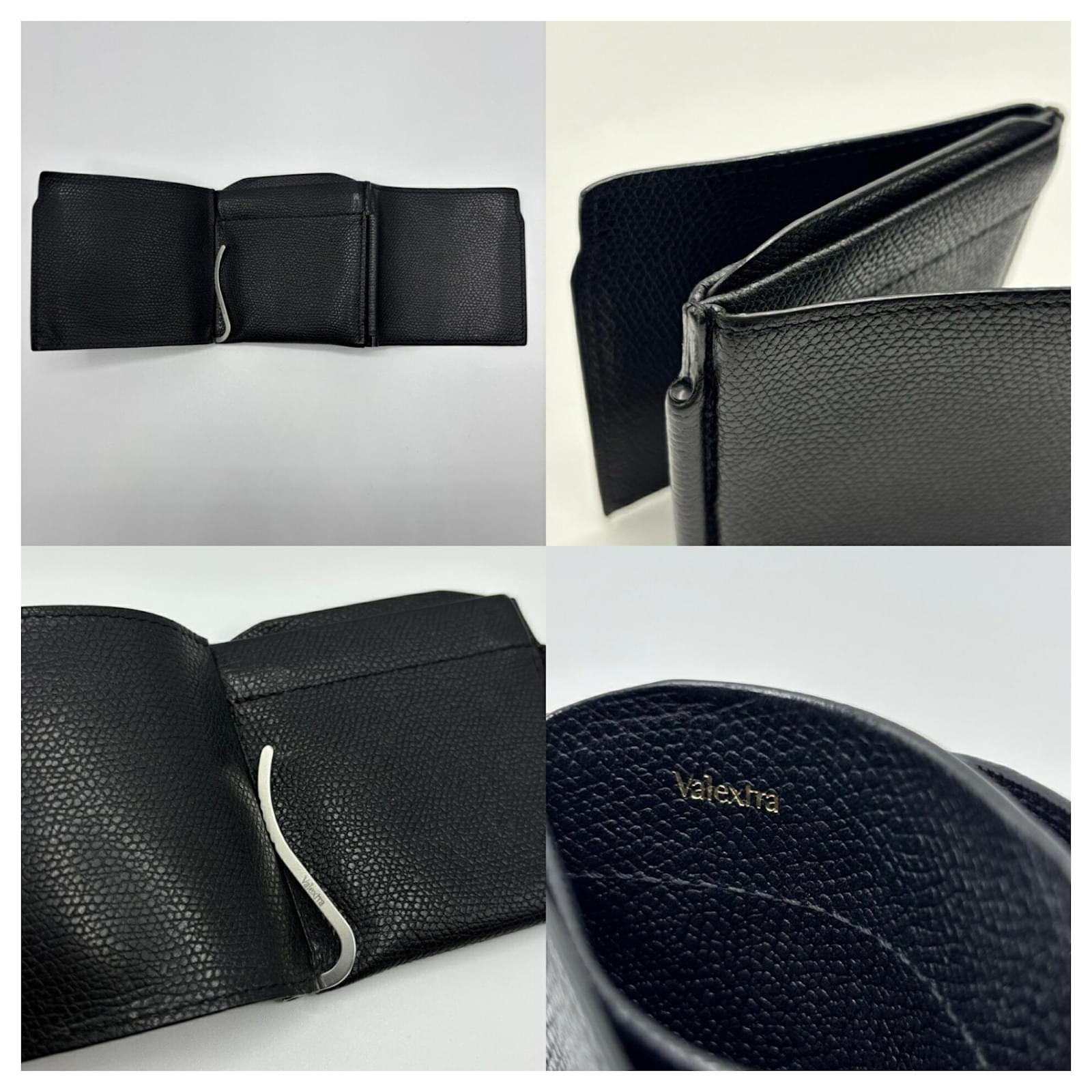 This Valextra wallet features a double money clip design crafted from black leather. Measuring 8.5cm x 10cm (3.34” x 3.93”), it is compact and practical for everyday use. The wallet is categorized as used but remains in good condition, showing slight traces of wear, including minor scratches and dirt. It comes with a dust bag for storage. Potential buyers are encouraged to review the images for a detailed view of the item’s condition and included accessories.