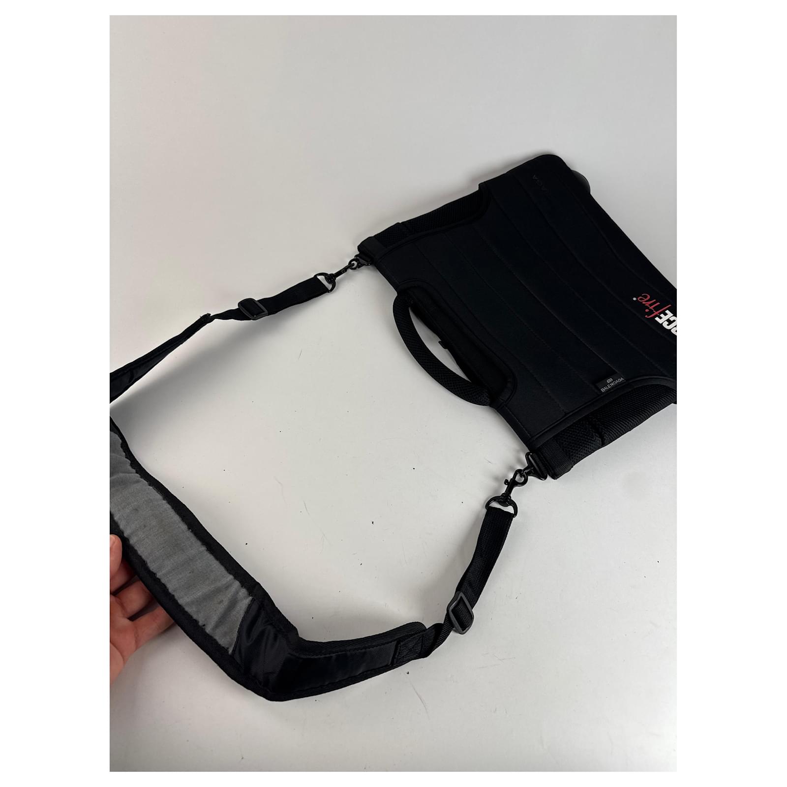BALENCIAGA Vintage Two-Way Canvas Handbag.\nThis vintage handbag is finely crafted of black canvas with black vegan neoprene\nand features \”SOURCE FIRE\” printed boldly on the front. It includes a neoprene\ntop handle and an adjustable shoulder strap. The bag opens via a Velcro two-way\nflap and closes securely with Velcro.\nBrand: BALENCIAGA\nModel: Vintage Two-Way Canvas Handbag\nCondition: Very Good\nCondition Details: The exterior shows light signs of wear with some peeling on\nthe shoulder strap, but remains in very good overall condition. The interior\nblack neoprene lining is clean and intact. The interior silver-tone steel\nhardware is bright.\nMain Color: Black\nInterior Color: Black\nHardware Color: Black (exterior), Silver (interior)\nMaterial: Canvas, Neoprene\nComes With: Balenciaga dust bag\nWidth: ~40 cm\nHeight: 33 cm\nDepth: 7 cm