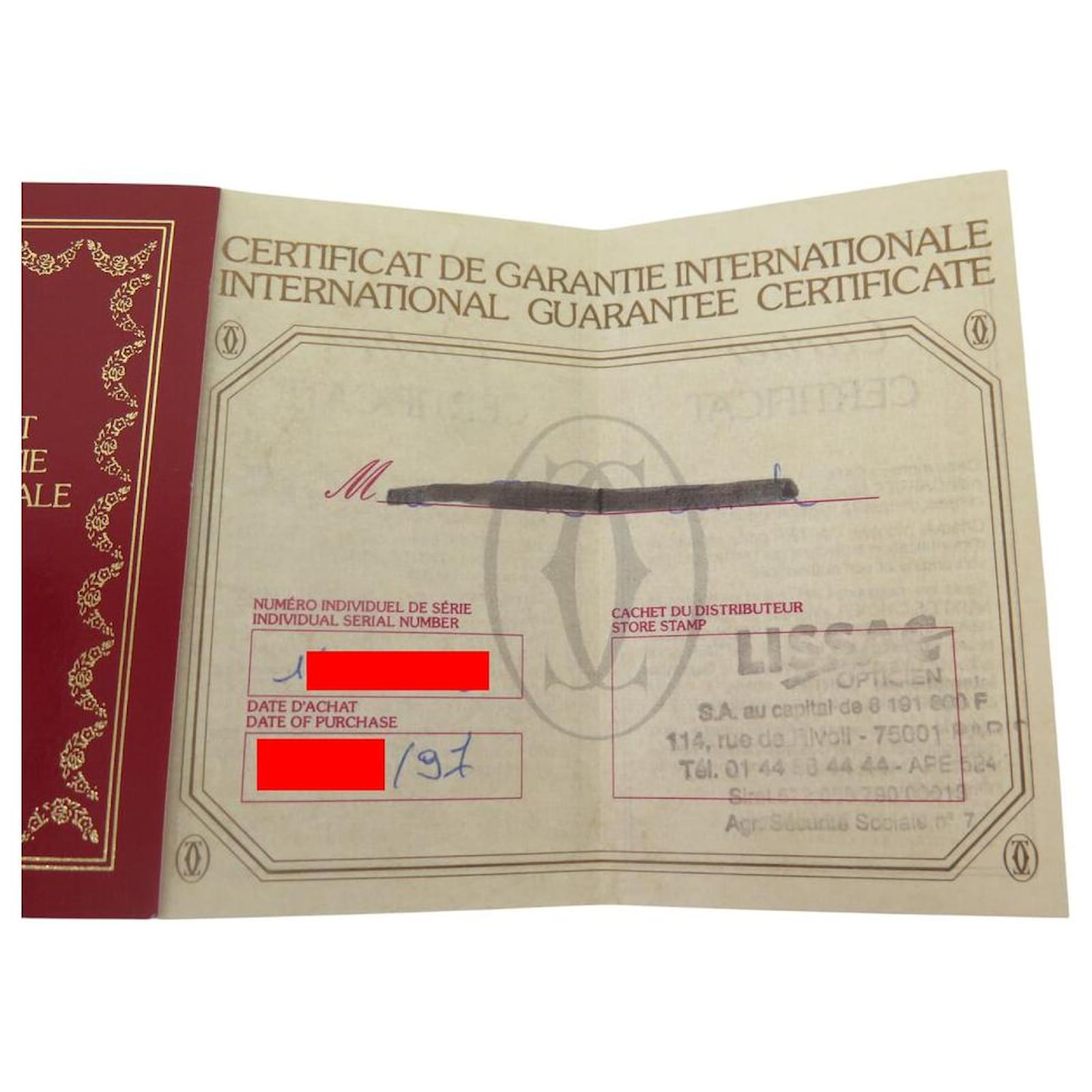 Accessories type glasses\nBrand: CARTIER\nModel: SAINT HONORE TRINITY\nYear of manufacture: 1997\nGender: Unisex\nValue of new: 1000 euros\n\nList of documents and accessories provided:\nCase\nOuter box\nBooklet\nInternational warranty\n\nCHARACTERISTICS:\nMaterial: gold plate\nColor: Gold\nNote: sold without lenses as frame only\nEstimated new value based on the last known value or an equivalent model\nDimensions: Width (cm): 13\nHeight of lens (cm): 4\nLength of temples (cm): 13\nDistance between temples at the back (cm): 13\n\nCondition: Excellent condition\nslight scratches – slight signs of oxidation – sold without lenses as frame only – see photos Reference: 268950