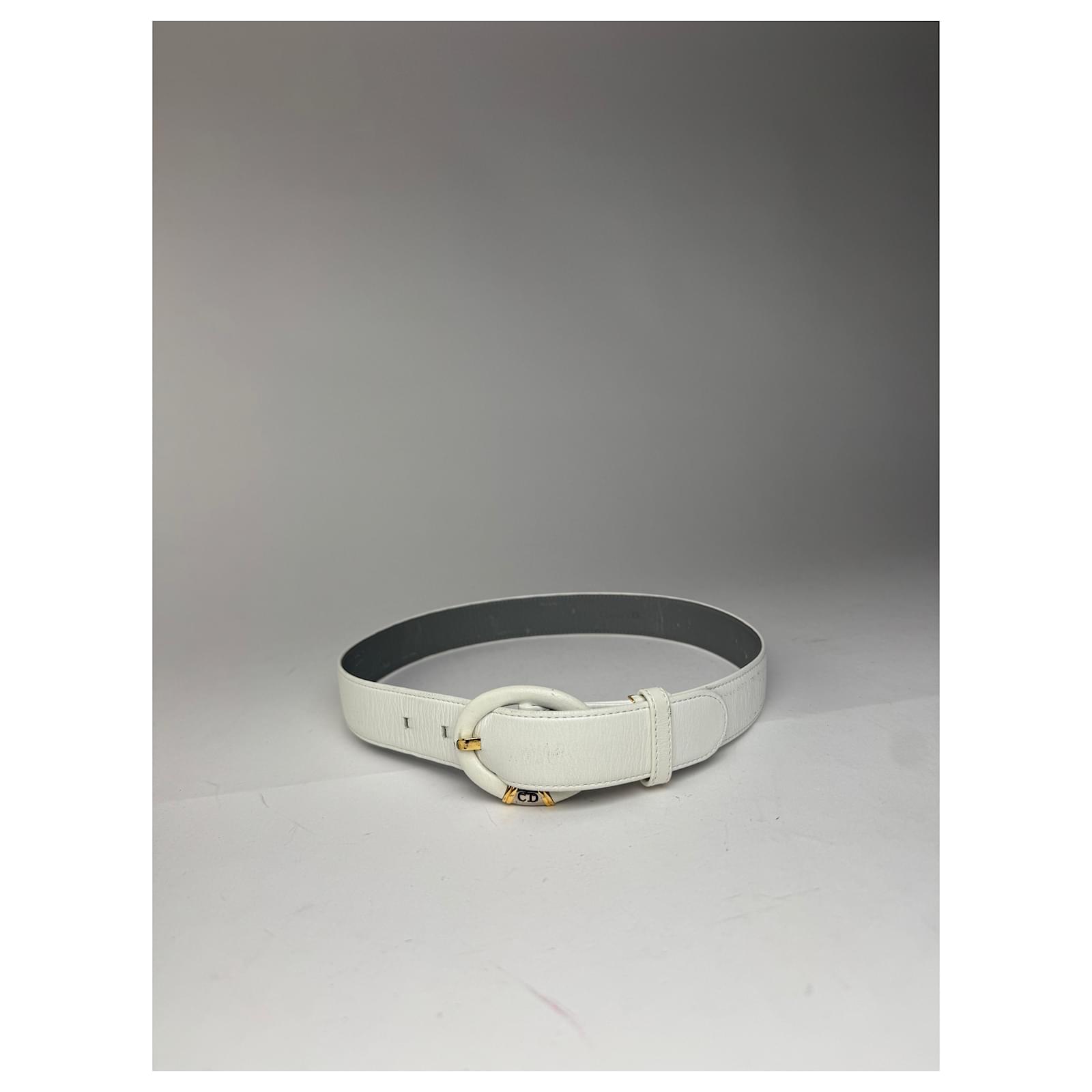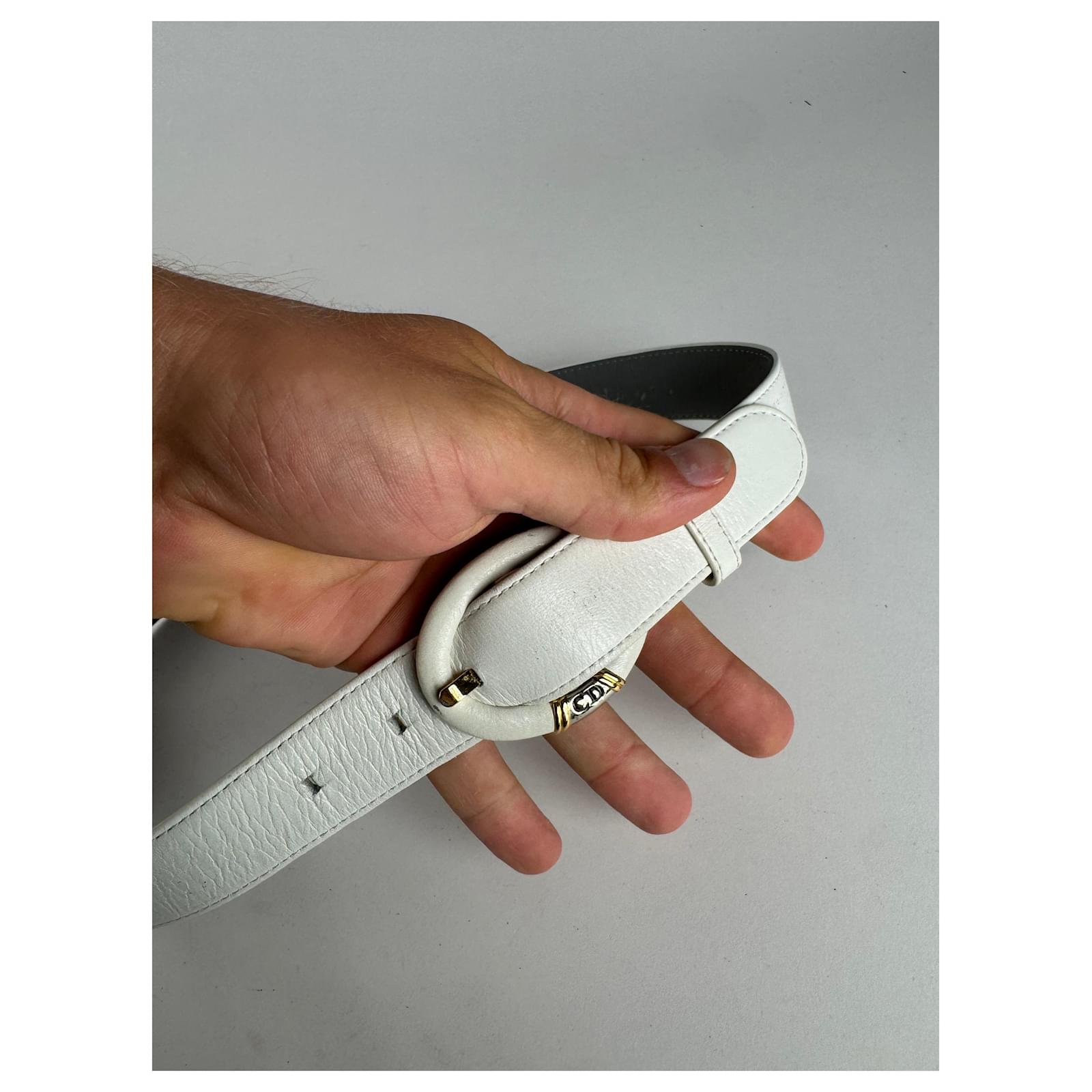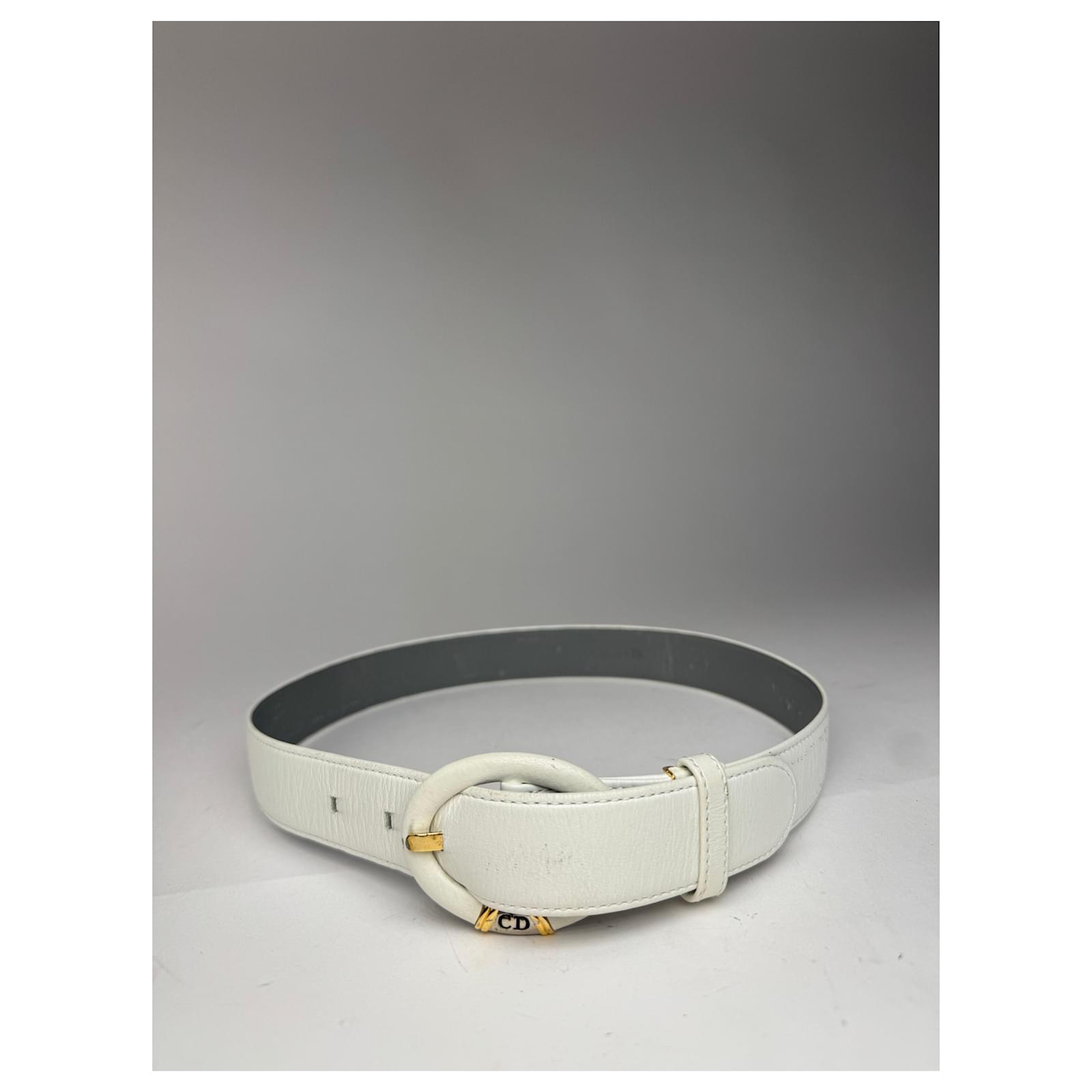 DIOR Vintage White Leather Belt with Gold-Tone Buckle.\nThis vintage belt is finely crafted of white leather with a gold-tone steel and\nleather-covered buckle. The interior is lined in gray leather. A refined piece\nlikely dating from the 1980s, it reflects Dior’s elegant take on everyday\naccessories.\nBrand: DIOR\nModel: Vintage Leather Belt\nCondition: Good\nCondition Details: Visible flaking on the interior and light stains on the white\nleather; otherwise in good vintage condition.\nMain Color: White\nInterior Colour: Grey\nHardware Color: Gold\nMaterial: Leather, Steel\nWidth: 3 cm\nLength: approx. 75 cm\nStyle: Unisex\nEra: 1980s (estimated)