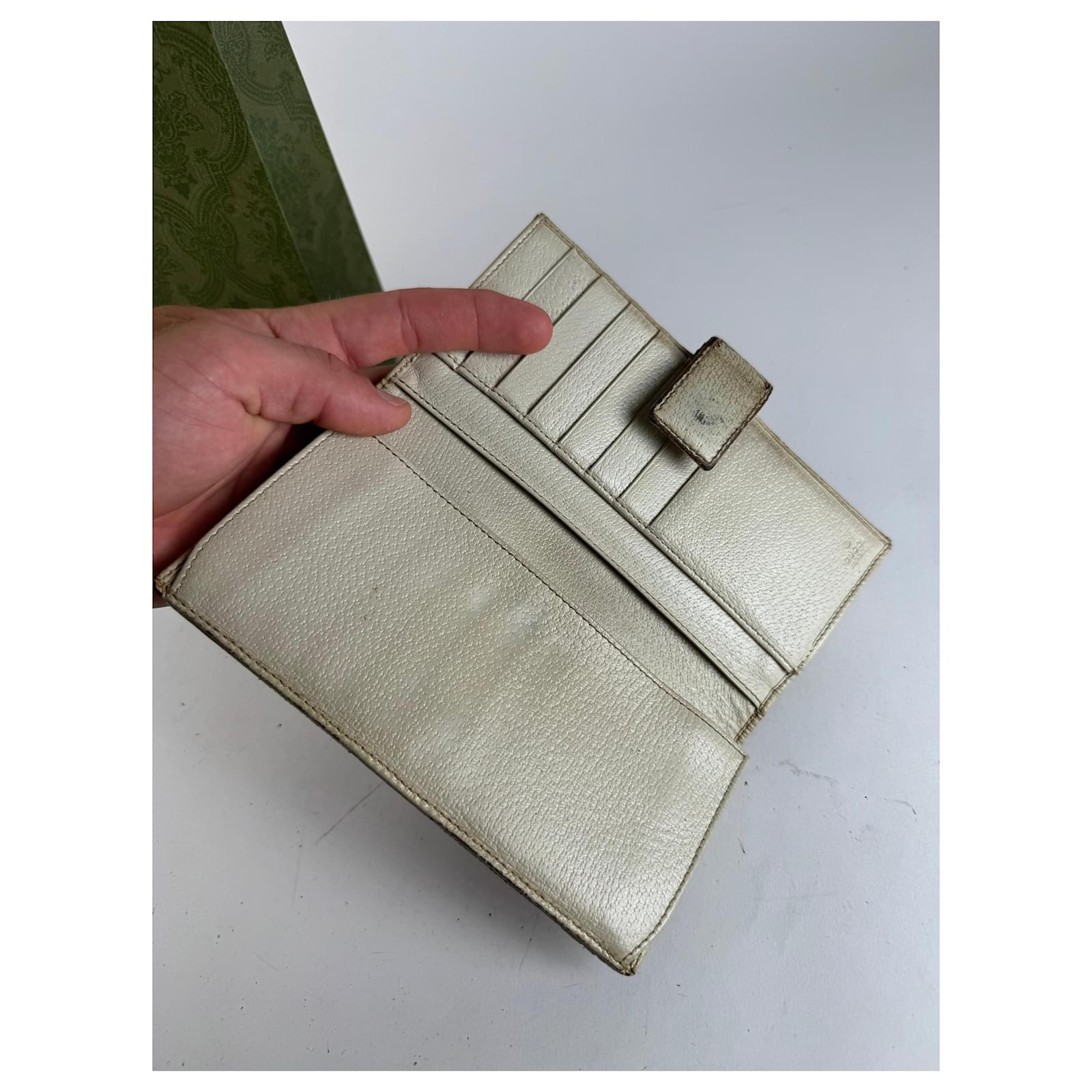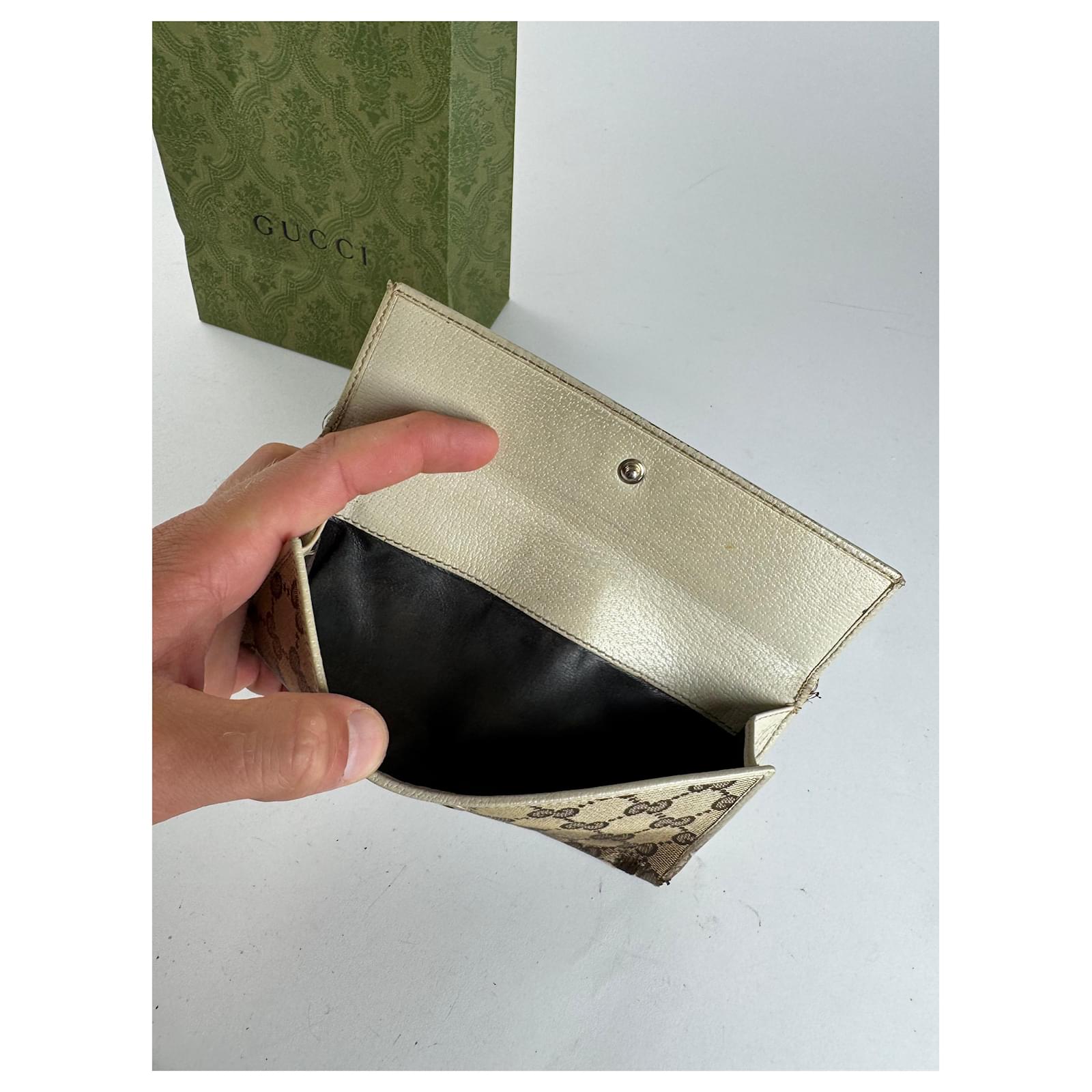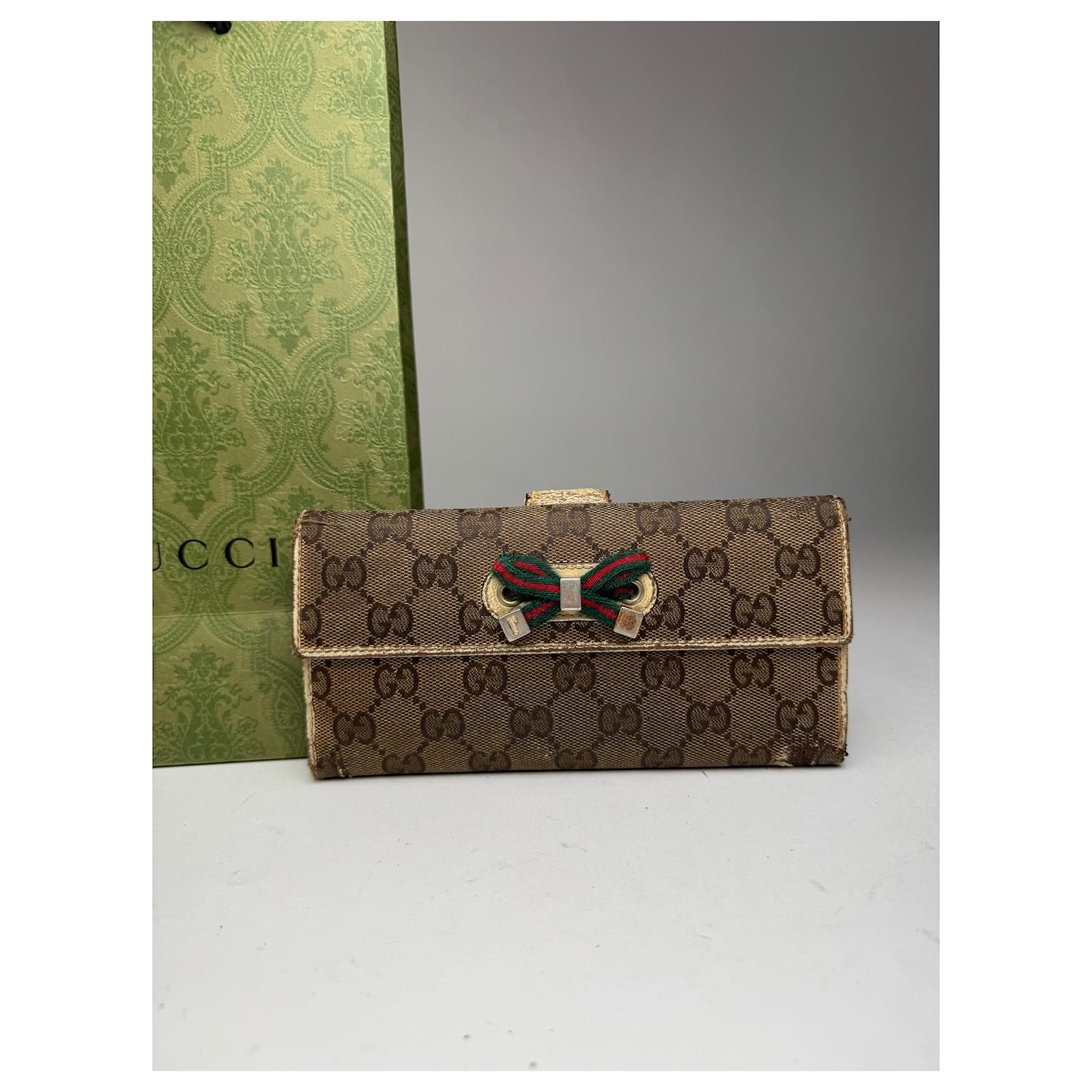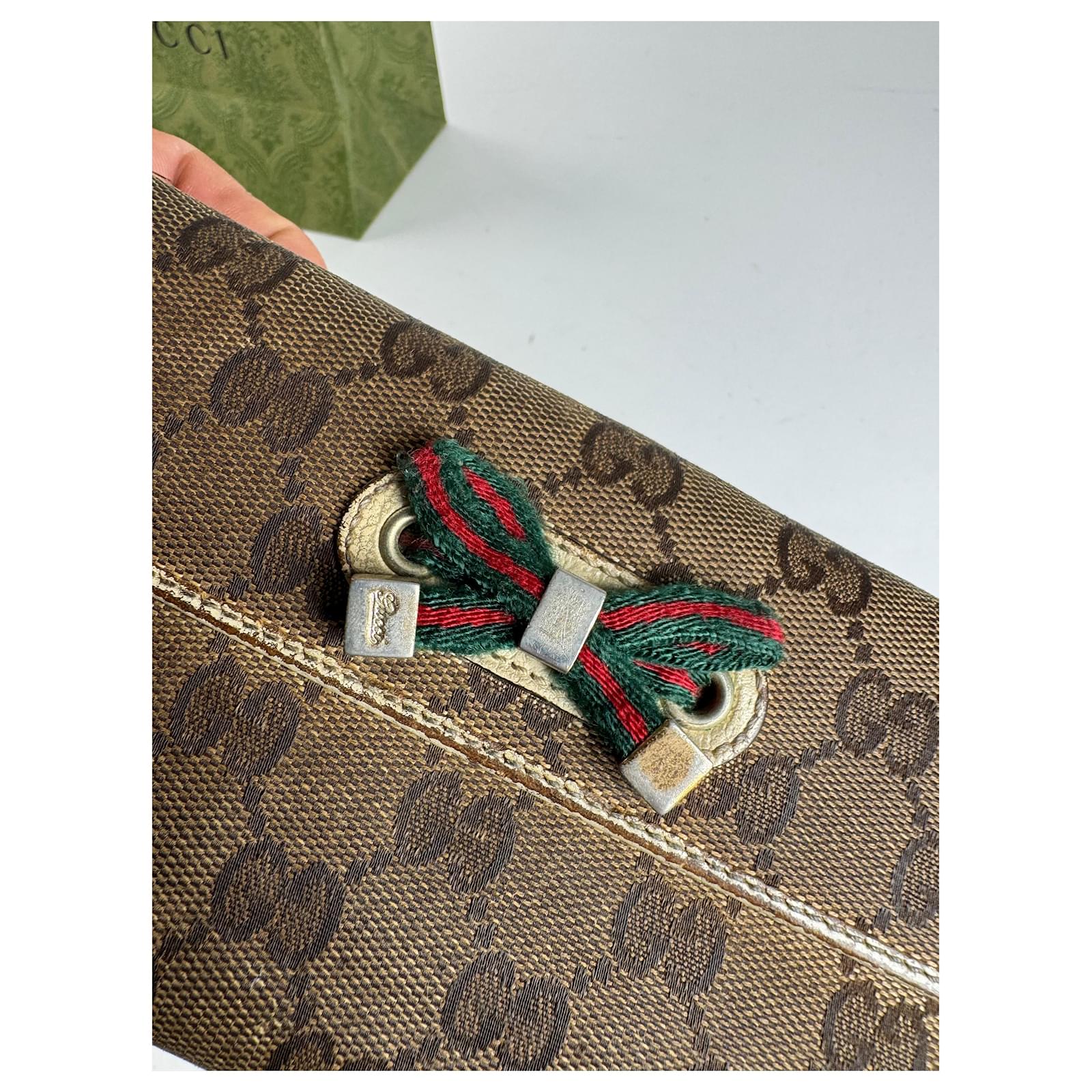 GUCCI Vintage Beige-Brown Monogram Wallet with Ribbon Detail. This charming\nvintage wallet is crafted from beige-brown Gucci monogram canvas and features a\nred and green striped ribbon appliqué on the front. The trim and interior are\nmade of white leather, with additional black canvas elements inside. Made in\nItaly, this piece comes with an original Gucci shopping bag.\nBrand: GUCCI\nModel: Vintage Wallet\nCondition: Very Good\nCondition Details: Shows visible staining and wear to some materials, but\nremains in very good vintage condition overall.\nMain Color: Beige-Brown\nInterior Color: White\nHardware Color: golden\nMaterial: Canvas, Leather\nTrimming: Black Canvas\nComes With: Gucci Shopping Bag\nWidth: 19 cm\nHeight: 9.5 cm\nMade in: Italy
