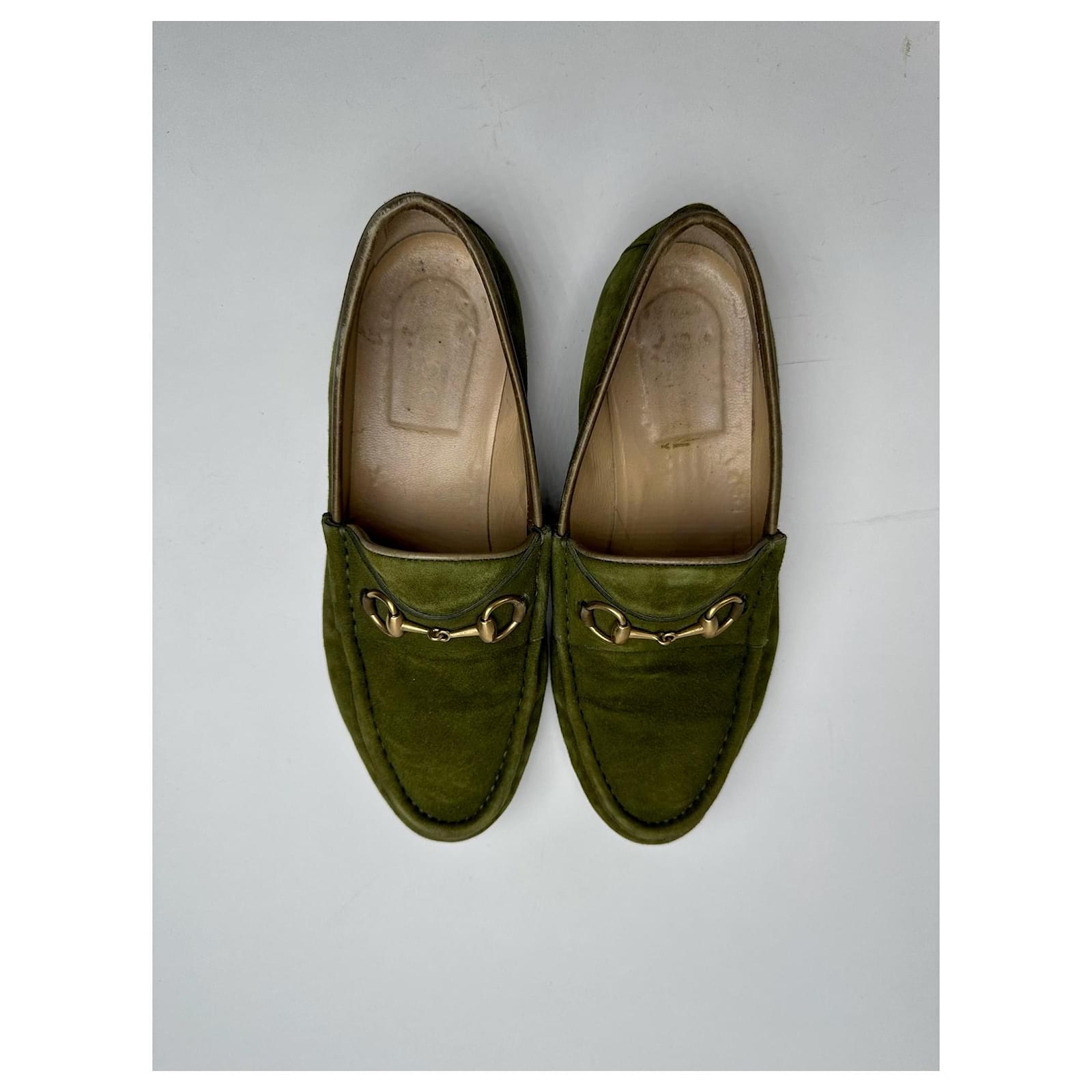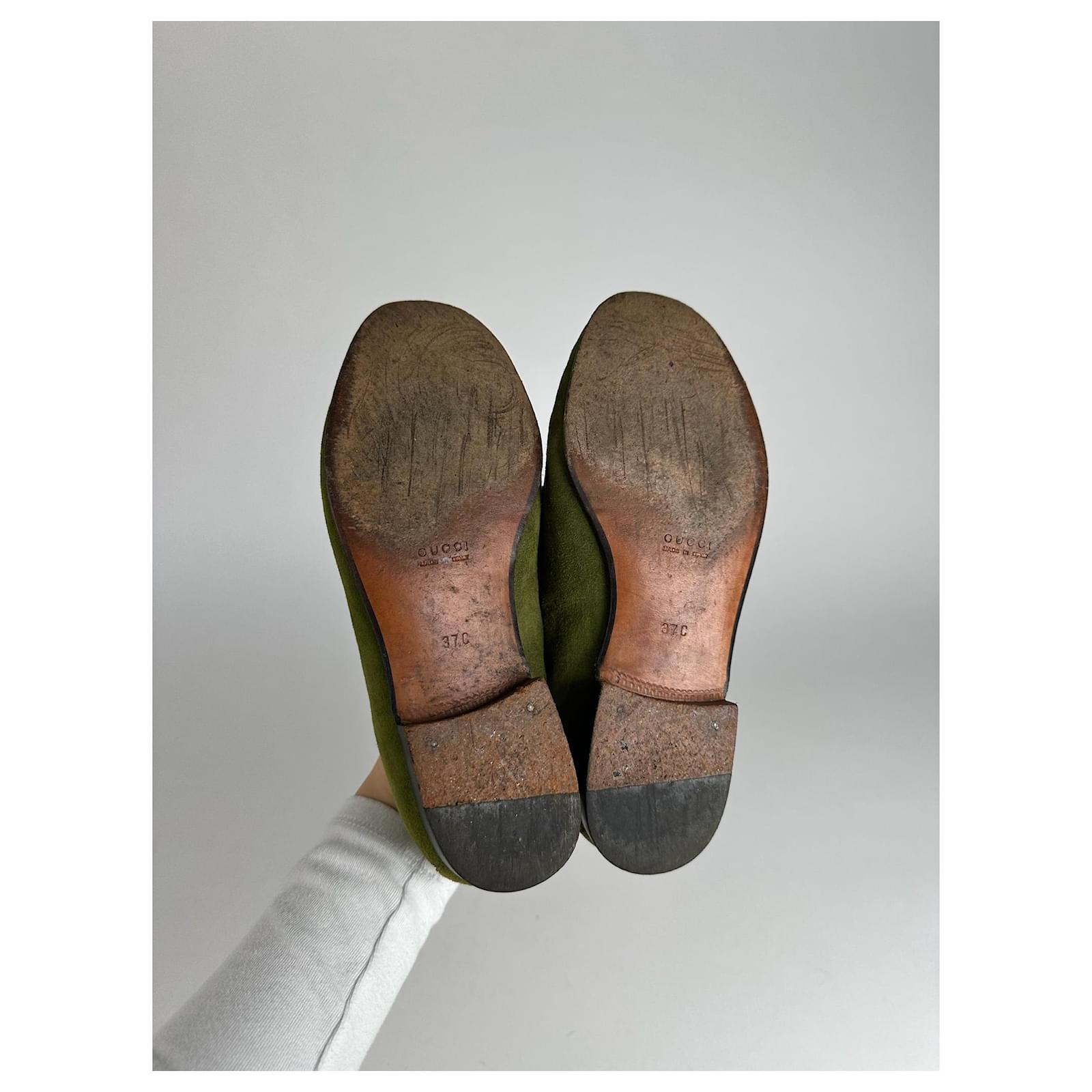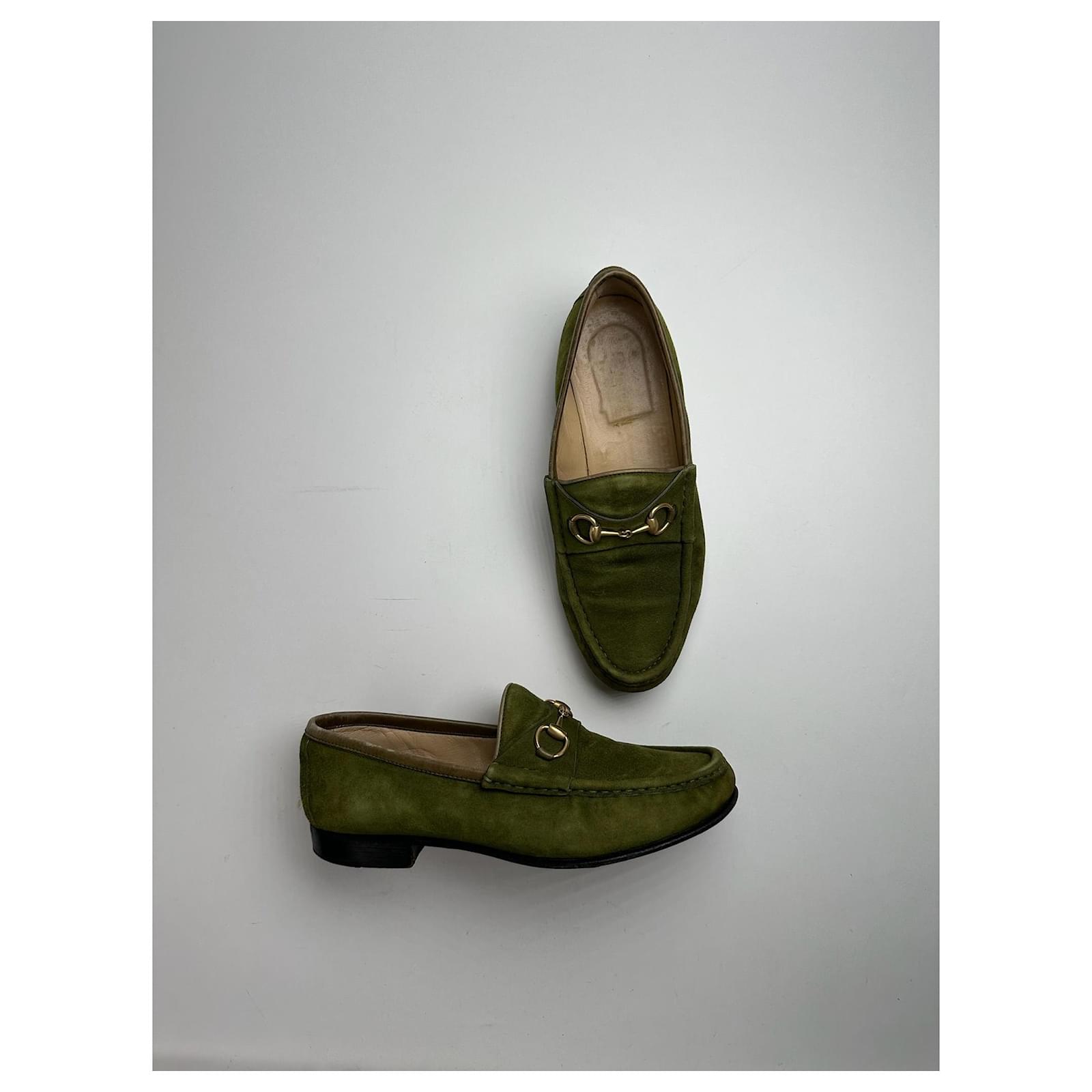 GUCCI Vintage Horsebit Loafers.\nThese chic loafers are crafted from dark green suede and feature the iconic gold-tone steel Horsebit detail across the upper. A timeless design with Italian craftsmanship and a refined silhouette.\nBrand: GUCCI\nModel: Horsebit\nCondition: Very Good\nCondition Details: The loafers are in very good condition with normal signs of wear including a worn sole creasing and some minor stains.\nMain Colour: Dark Green\nMaterial: Suede\nHardware Colour: Gold\nSize: 37C\nMade in: Italy