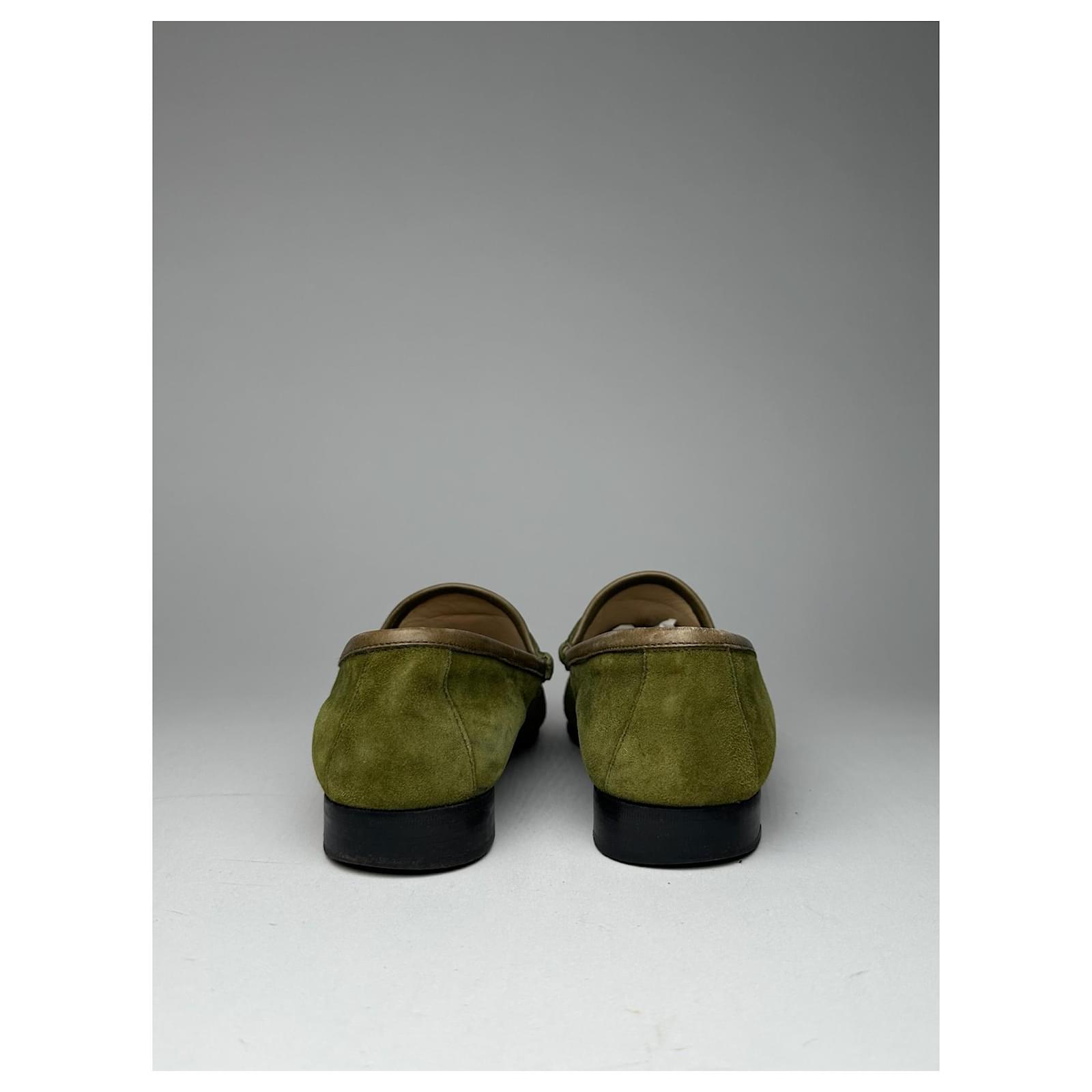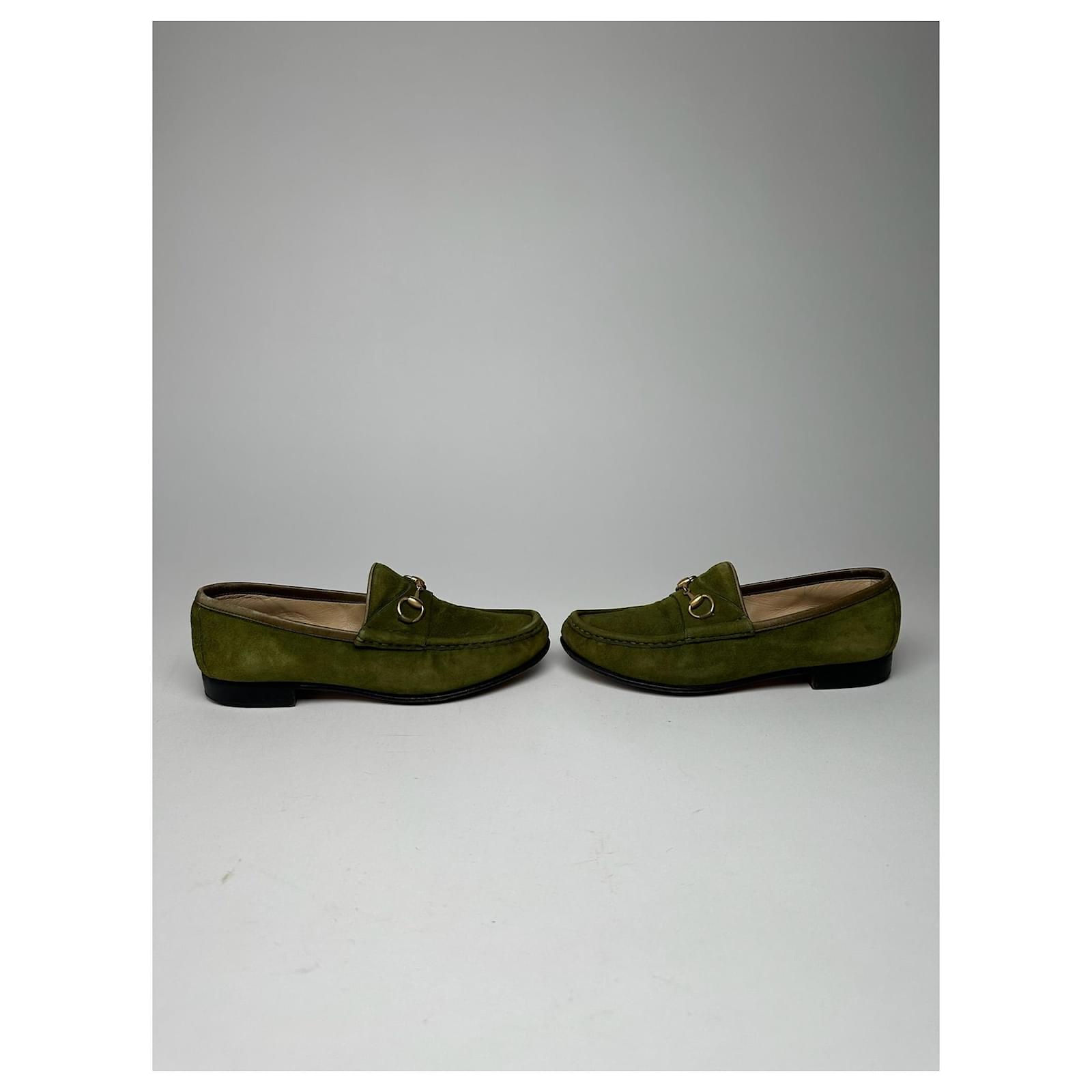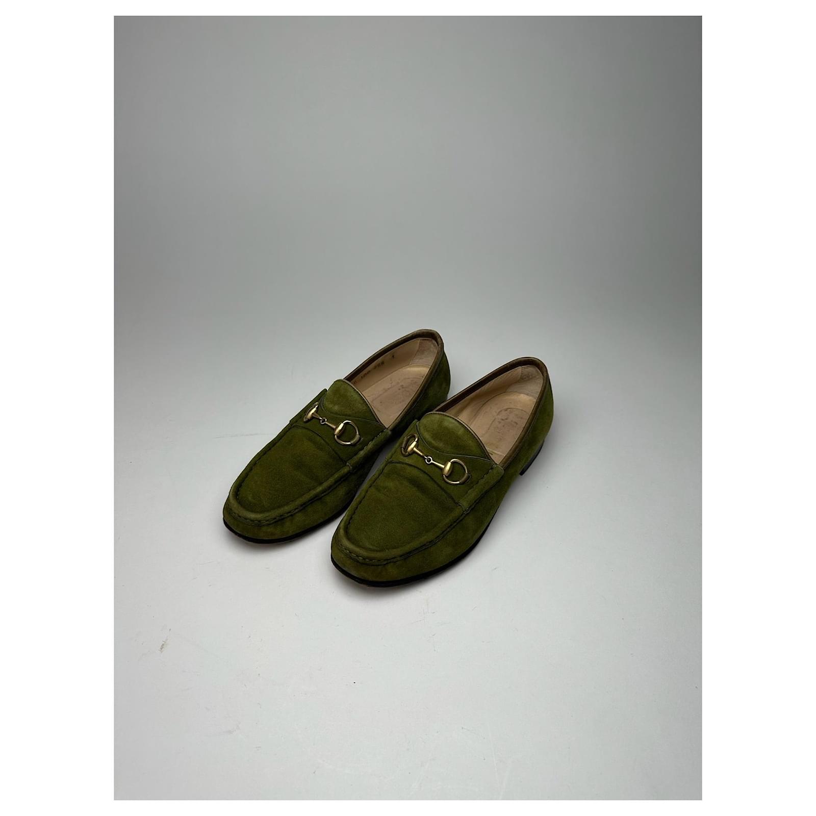 GUCCI Vintage Horsebit Loafers.\nThese chic loafers are crafted from dark green suede and feature the iconic gold-tone steel Horsebit detail across the upper. A timeless design with Italian craftsmanship and a refined silhouette.\nBrand: GUCCI\nModel: Horsebit\nCondition: Very Good\nCondition Details: The loafers are in very good condition with normal signs of wear including a worn sole creasing and some minor stains.\nMain Colour: Dark Green\nMaterial: Suede\nHardware Colour: Gold\nSize: 37C\nMade in: Italy