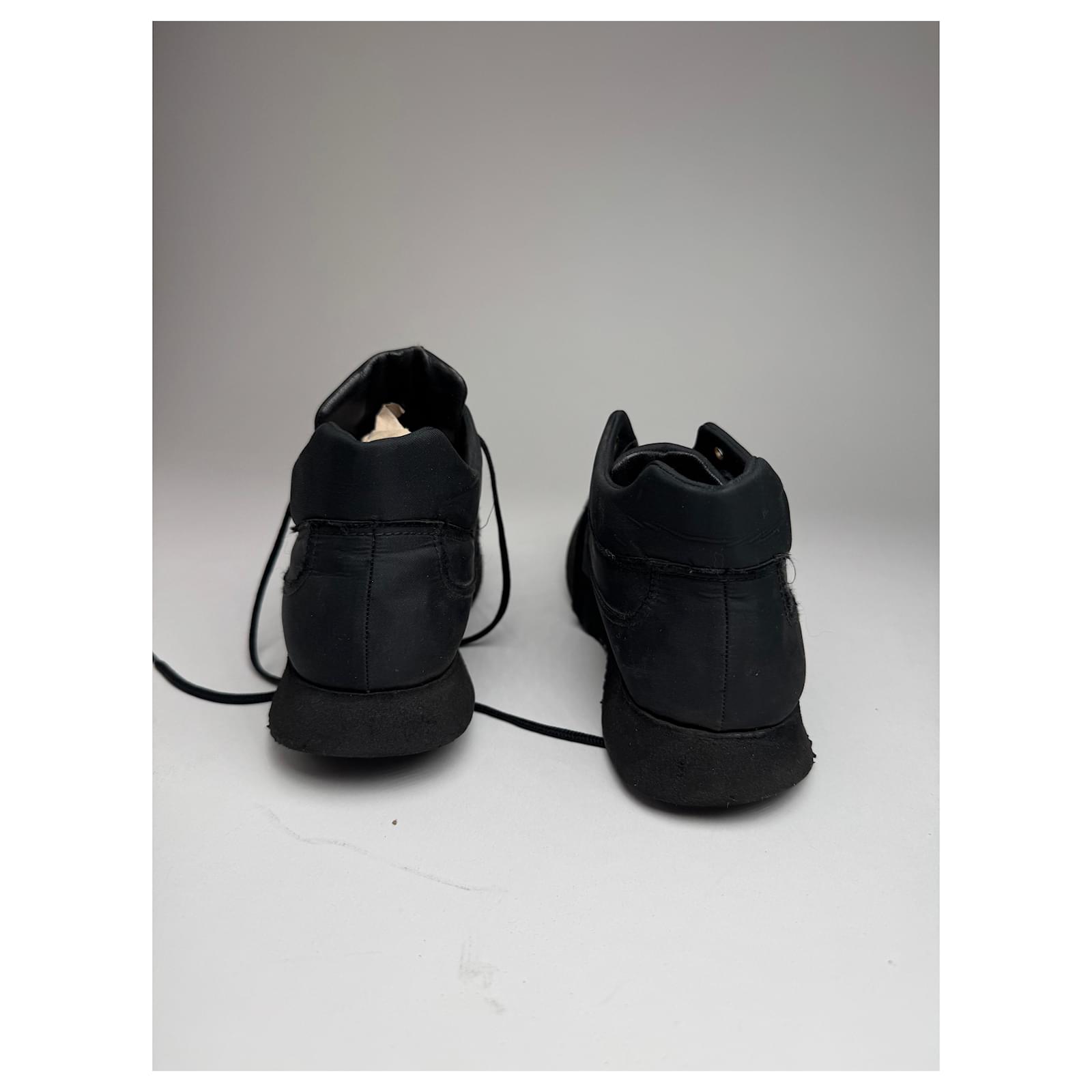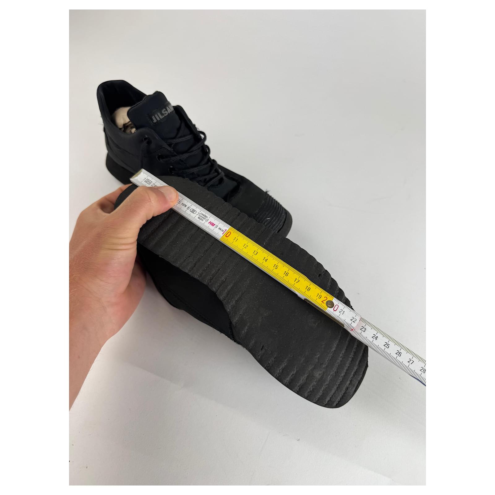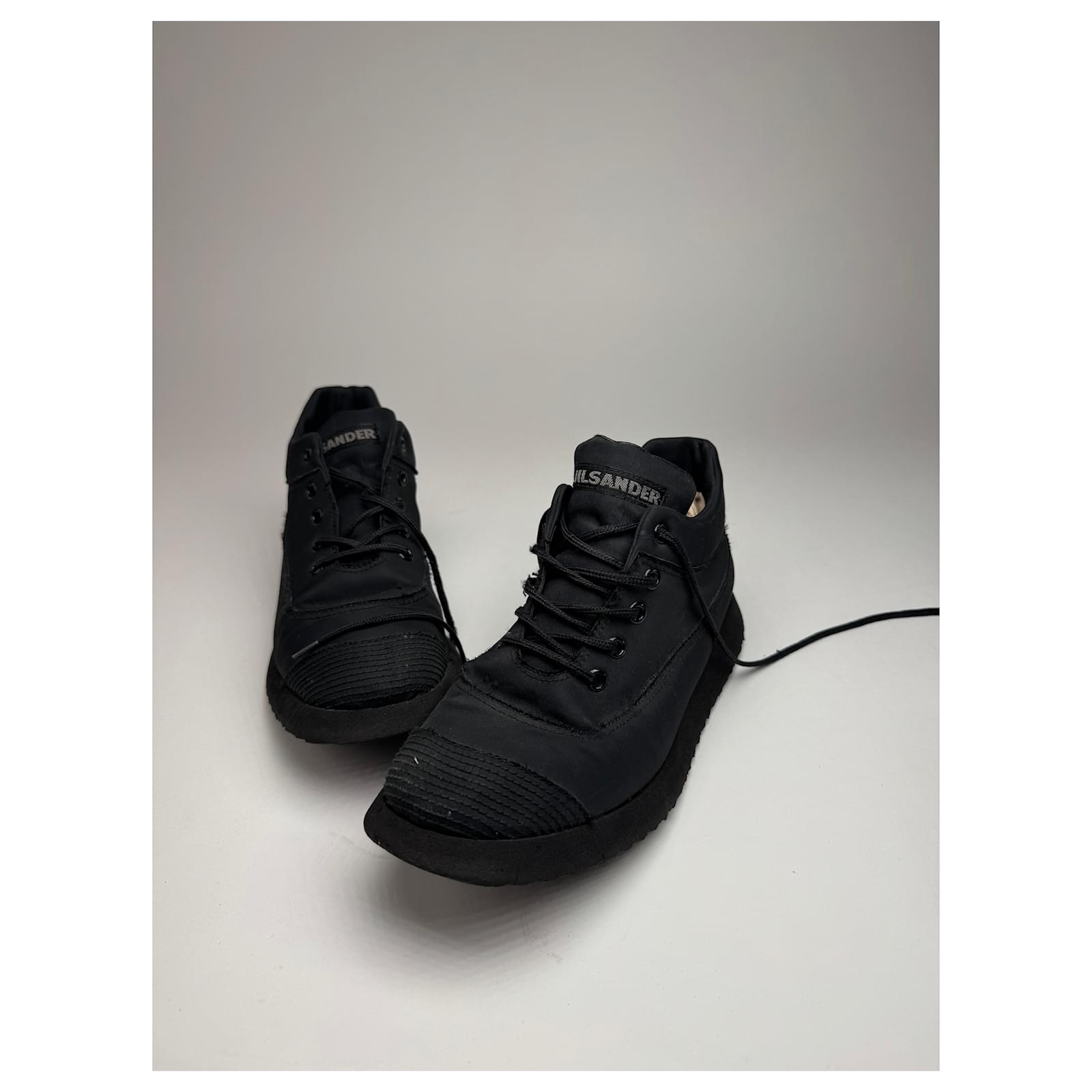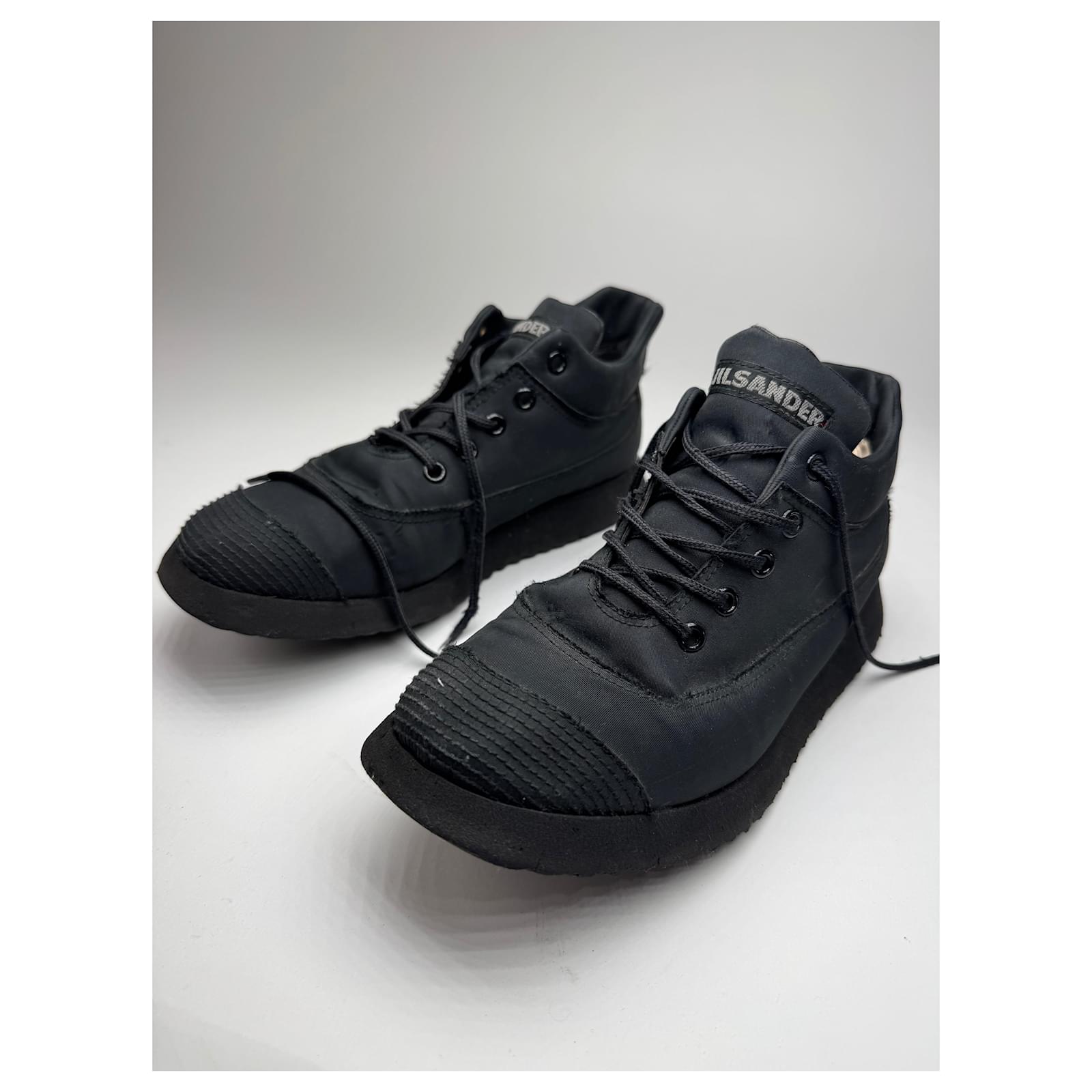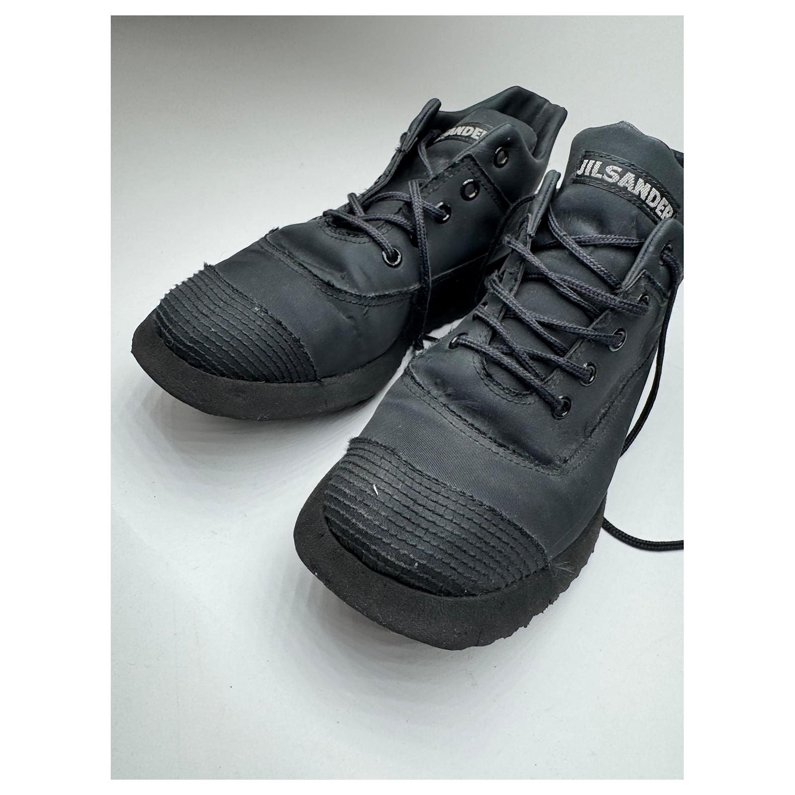 JIL SANDER Vintage Sneakers.\nThese chic sneakers are finely crafted of black canvas and black synthetic material with matching black canvas laces.\nBrand: JIL SANDER\nCondition: Excellent\nCondition Details: The material is clean and beautiful in excellent vintage condition with minor signs of wear. Estimated from the 80s.\nMain Colour: Black\nMaterial: Canvas Synthetic\nEstimated Size: EU 38 (based on outsole length of 24.5 cm)
