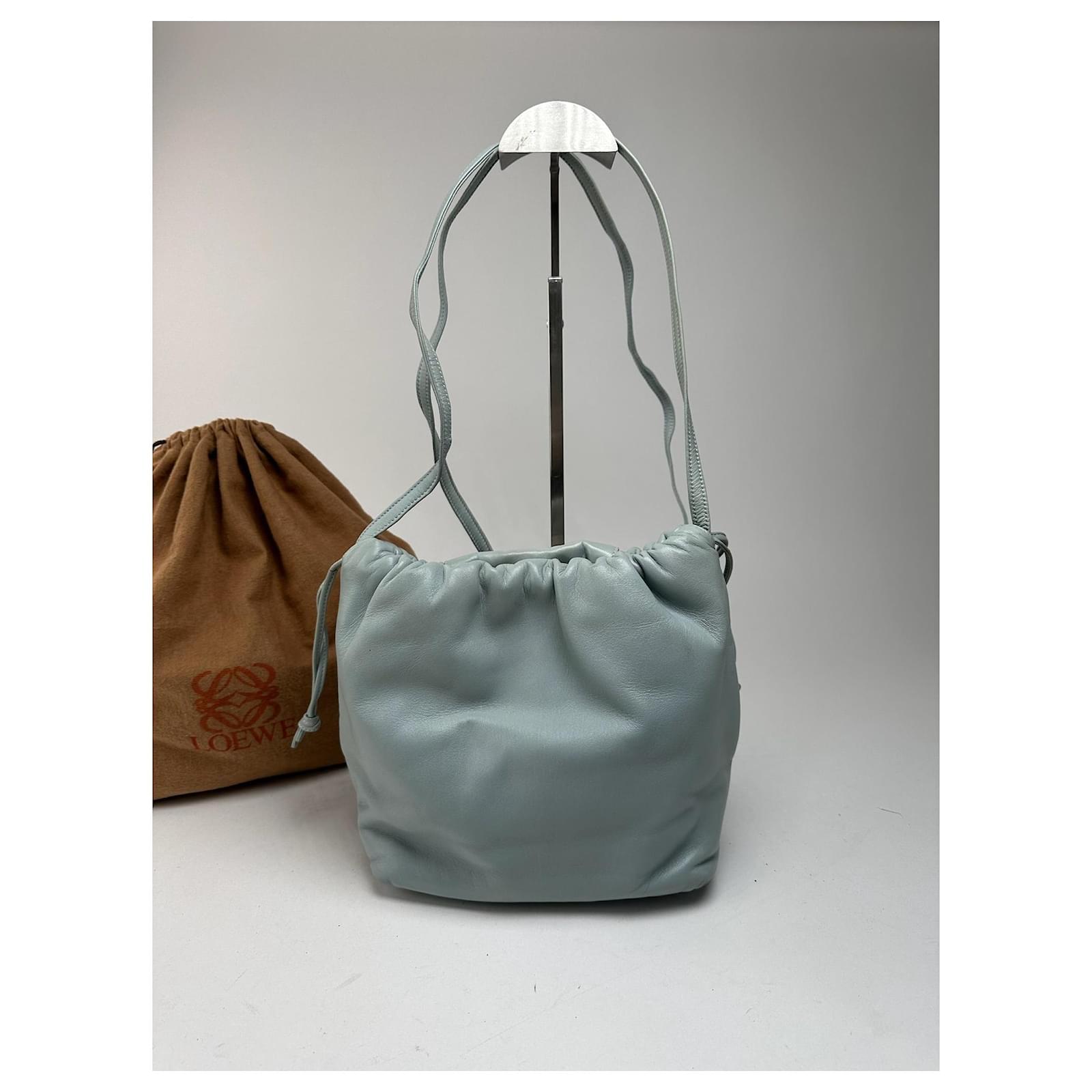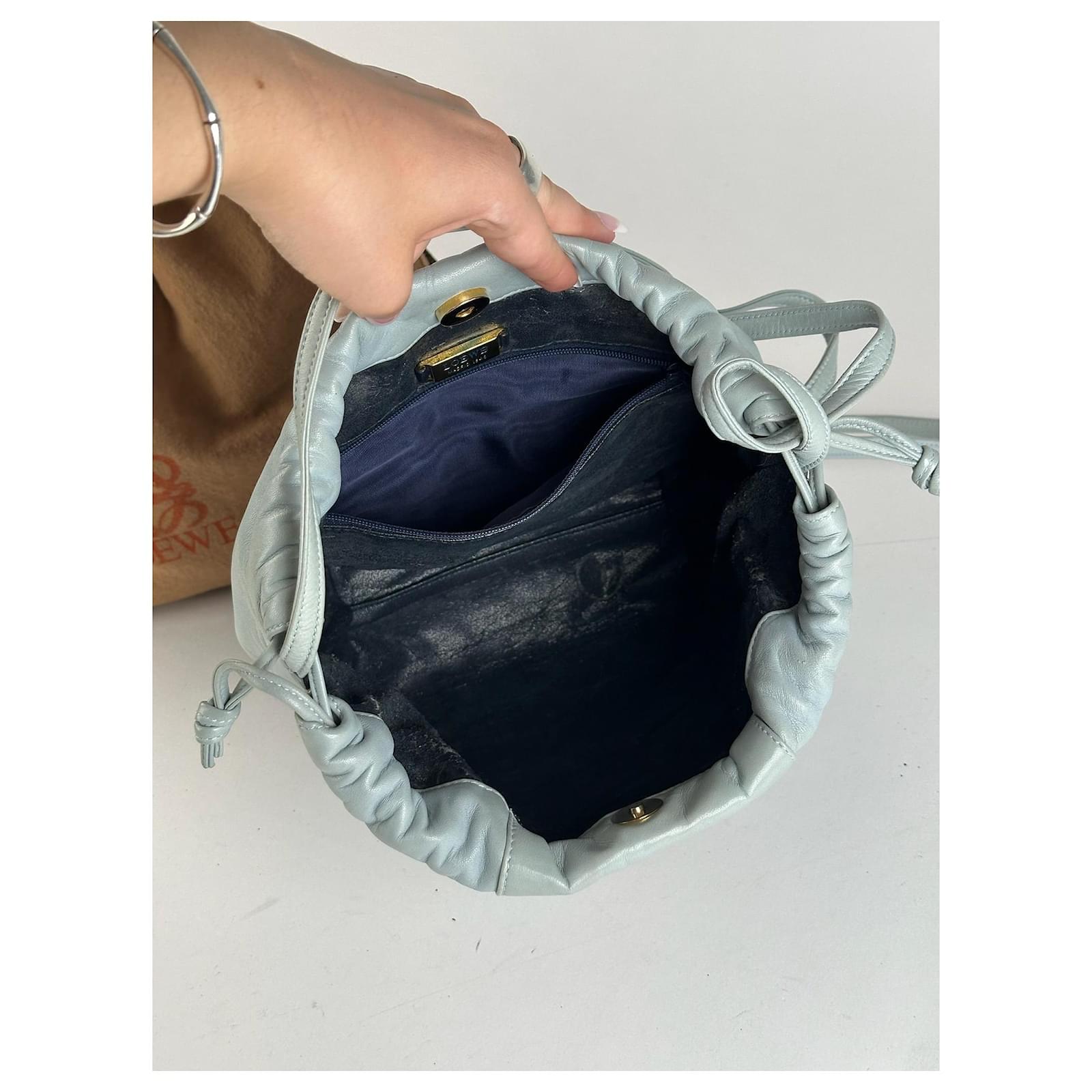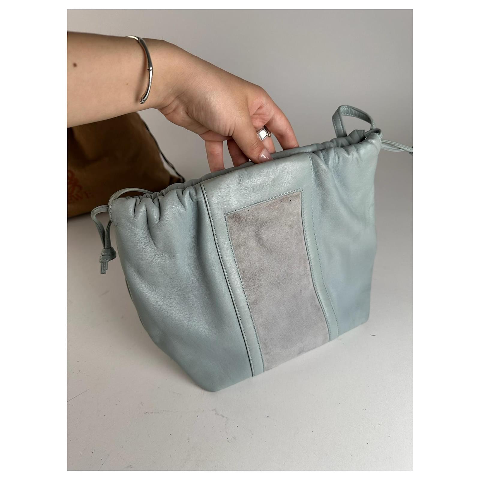 LOEWE Vintage Flamenco Light Blue Leather 2-Way Handbag. This versatile unisex\n2-way handbag is crafted from light blue smooth leather and matching suede. It\nfeatures a magnetic closure and is lined in black leather. The Flamenco model\nwas first introduced in the 1980s and is known for its soft silhouette and\nartisanal drawstring-inspired design, reflecting LOEWE’s heritage in Spanish leather craftsmanship.\nleather craftsmanship.\nBrand: LOEWE\nModel: Flamenco\nCondition: Very Good\nCondition Details: The exterior is in very good condition with minimal signs of\nwear. The interior leather lining is heavily damaged and shows significant\npeeling.\nMain Color: Light Blue\nInterior Color: Black\nHardware Color: golden\nMaterial: Leather, Suede\nComes With: Dustbag\nWidth: 21 cm\nHeight: 23 cm