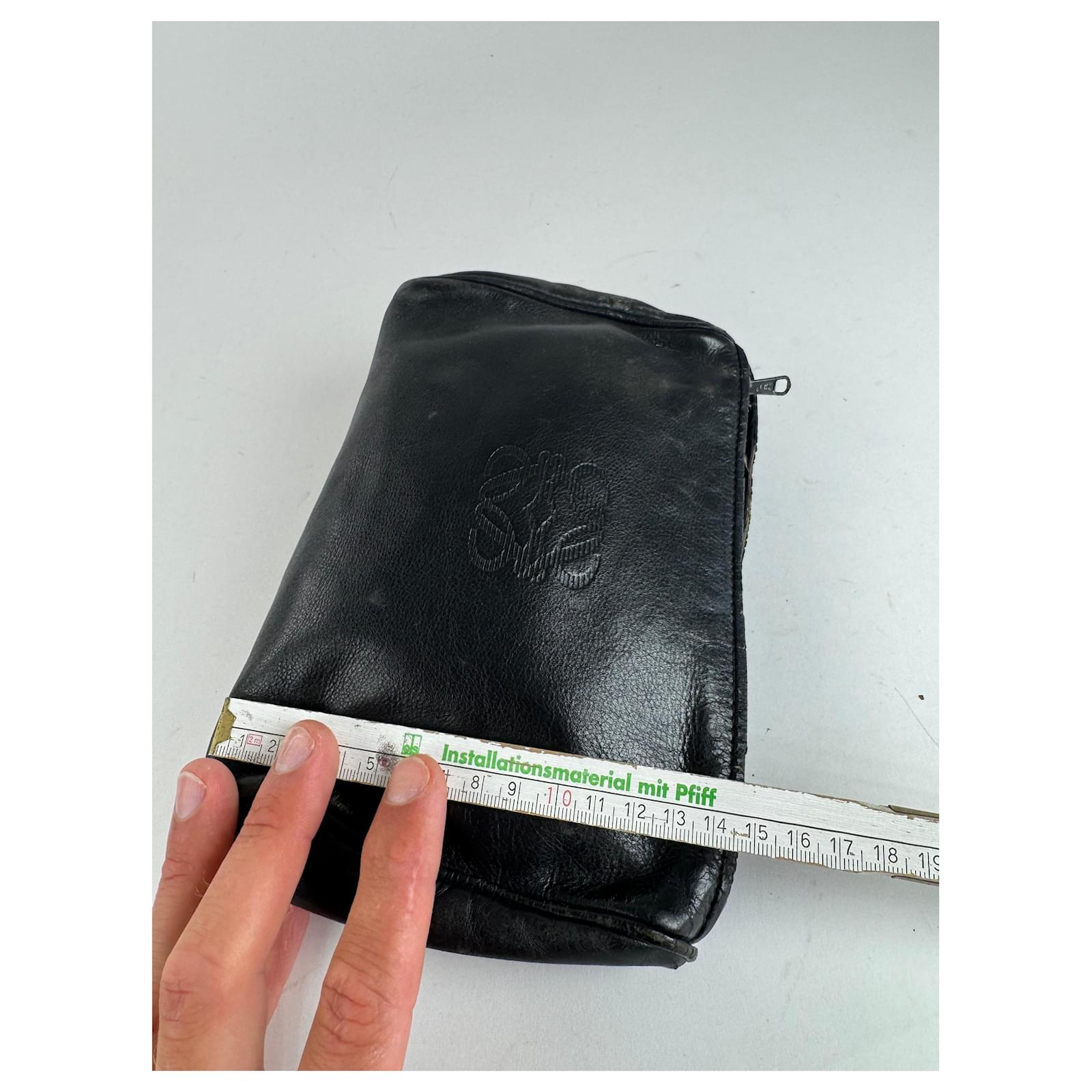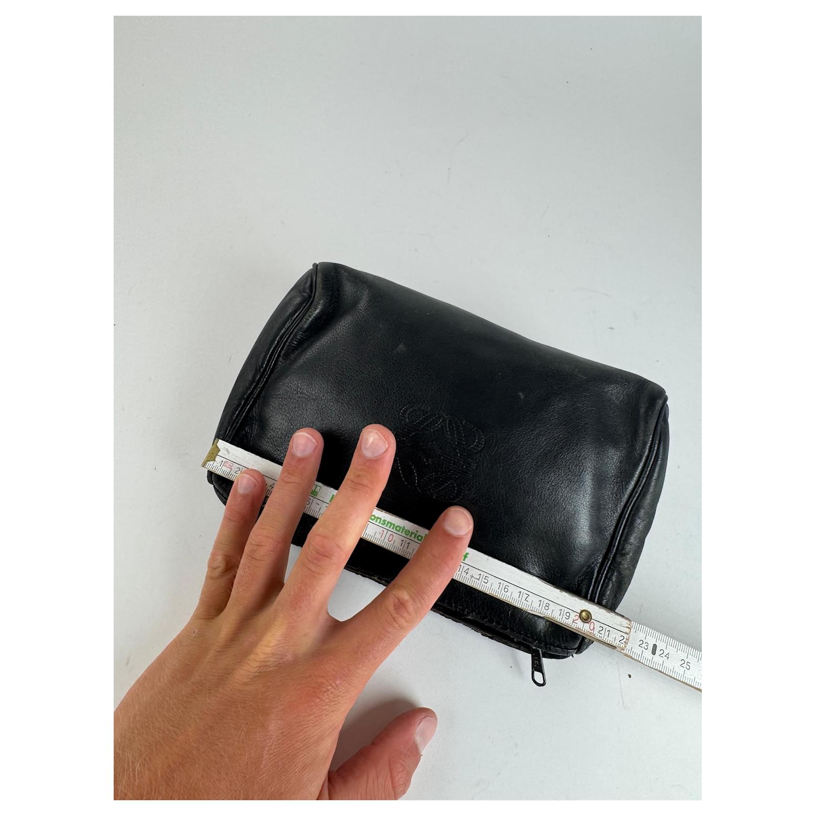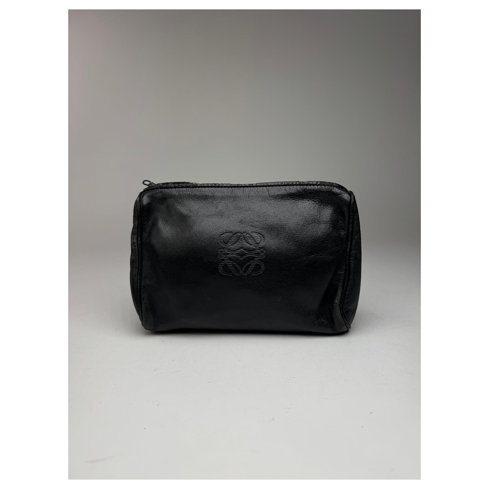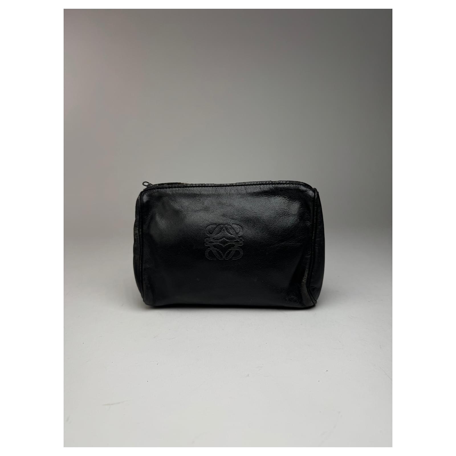LOEWE MADRID Vintage Anagram Clutch. This classic clutch from the 1980s is crafted of black leather and features the embossed Loewe Anagram logo on the front. Designed in 1970 by Spanish painter Vicente Vela, the Anagram intertwines four Ls in a mirrored, baroque-inspired composition that has become an enduring symbol of Loewe’s craftsmanship and heritage. The piece has a top zipper closure and is lined in grey canvas. Made in Spain.\nBrand: LOEWE MADRID\nModel: Vintage Anagram Clutch\nCondition: Very Good\nCondition Details: The exterior shows material wear and some color fading, but remains in very good condition considering its age. The interior is clean and intact.\nMain Colour: Black\nInterior Colour: Grey\nMaterial: Leather, Canvas\nWidth: 21.5 cm\nHeight: 14.5 cm\nDepth: 7 cm