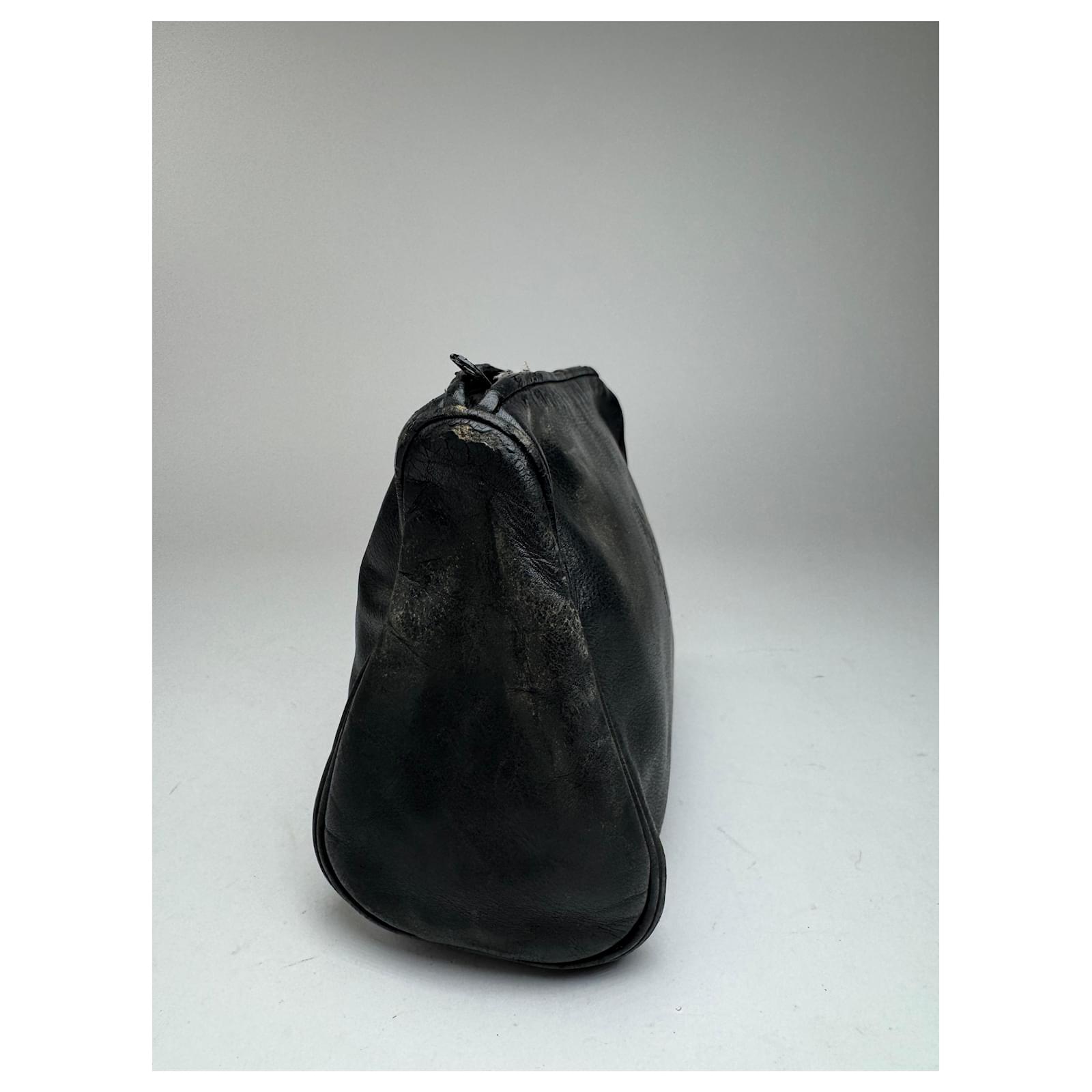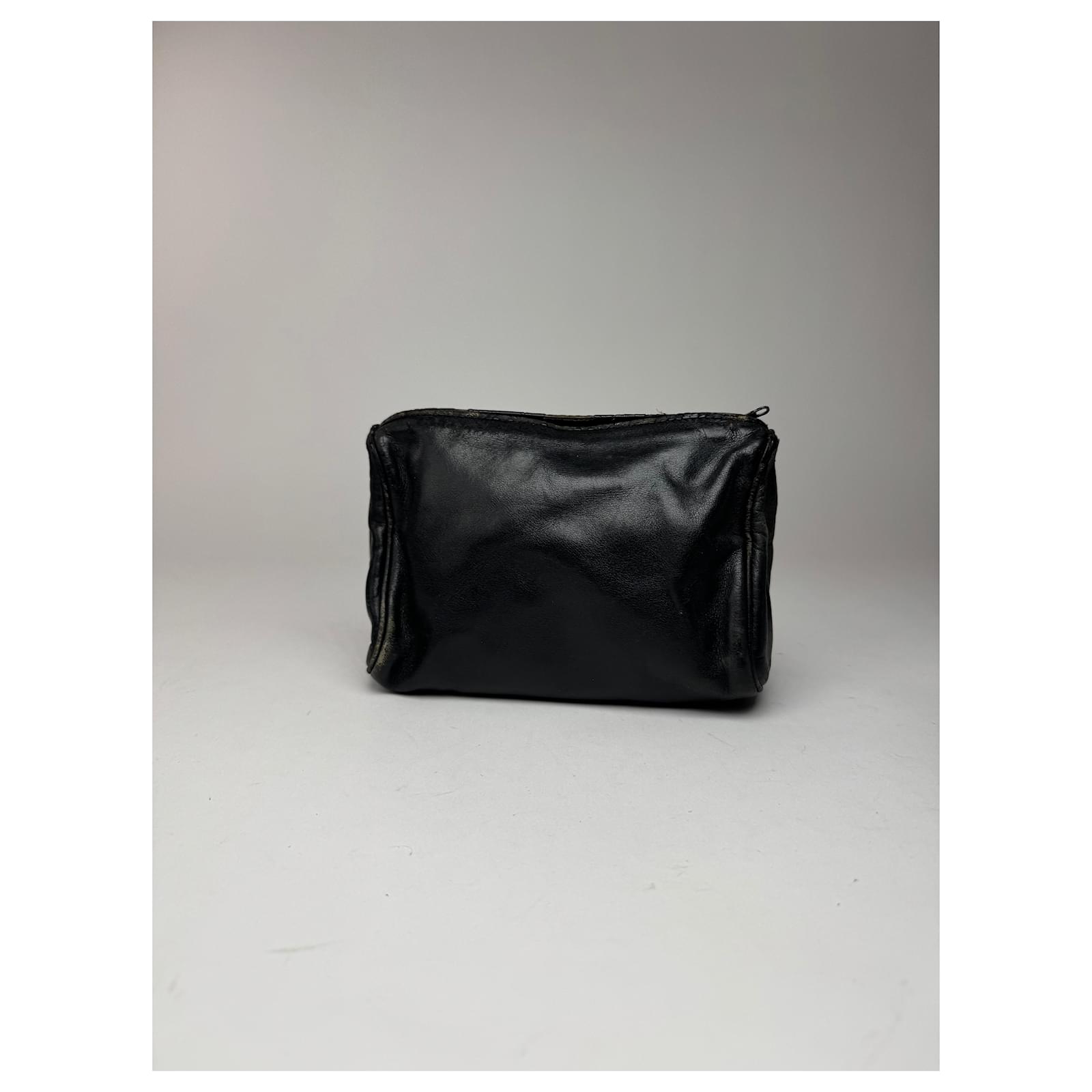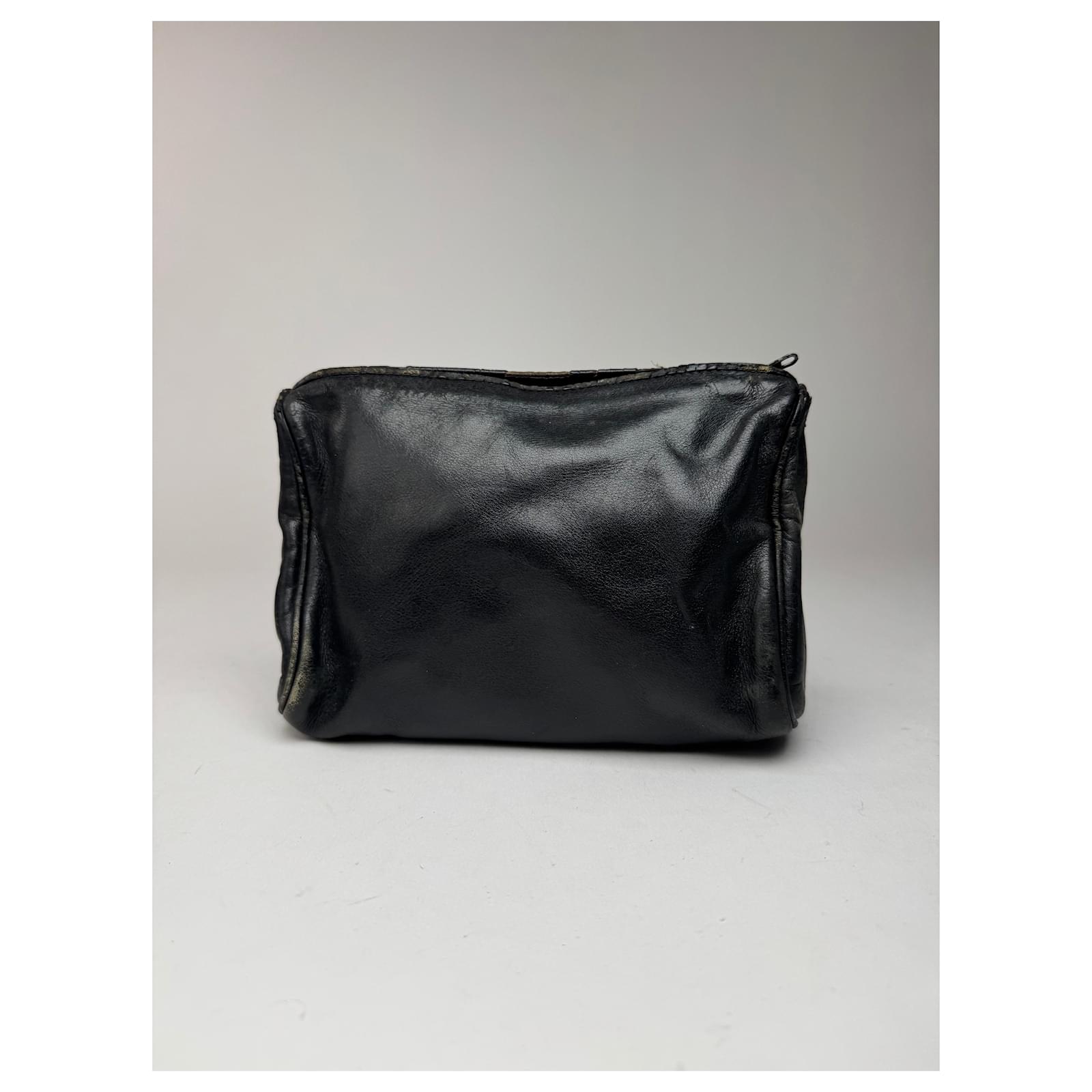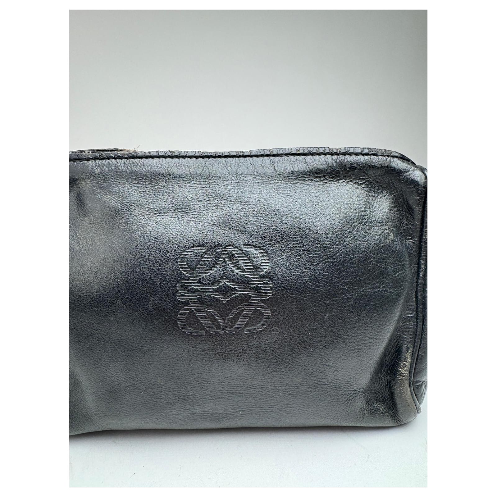 LOEWE MADRID Vintage Anagram Clutch. This classic clutch from the 1980s is crafted of black leather and features the embossed Loewe Anagram logo on the front. Designed in 1970 by Spanish painter Vicente Vela, the Anagram intertwines four Ls in a mirrored, baroque-inspired composition that has become an enduring symbol of Loewe’s craftsmanship and heritage. The piece has a top zipper closure and is lined in grey canvas. Made in Spain.\nBrand: LOEWE MADRID\nModel: Vintage Anagram Clutch\nCondition: Very Good\nCondition Details: The exterior shows material wear and some color fading, but remains in very good condition considering its age. The interior is clean and intact.\nMain Colour: Black\nInterior Colour: Grey\nMaterial: Leather, Canvas\nWidth: 21.5 cm\nHeight: 14.5 cm\nDepth: 7 cm