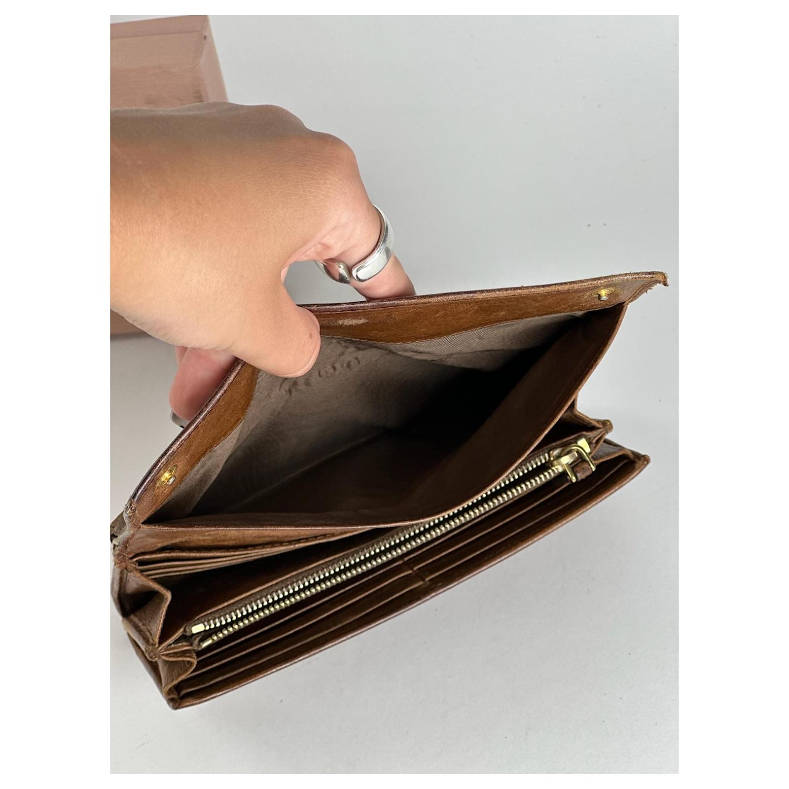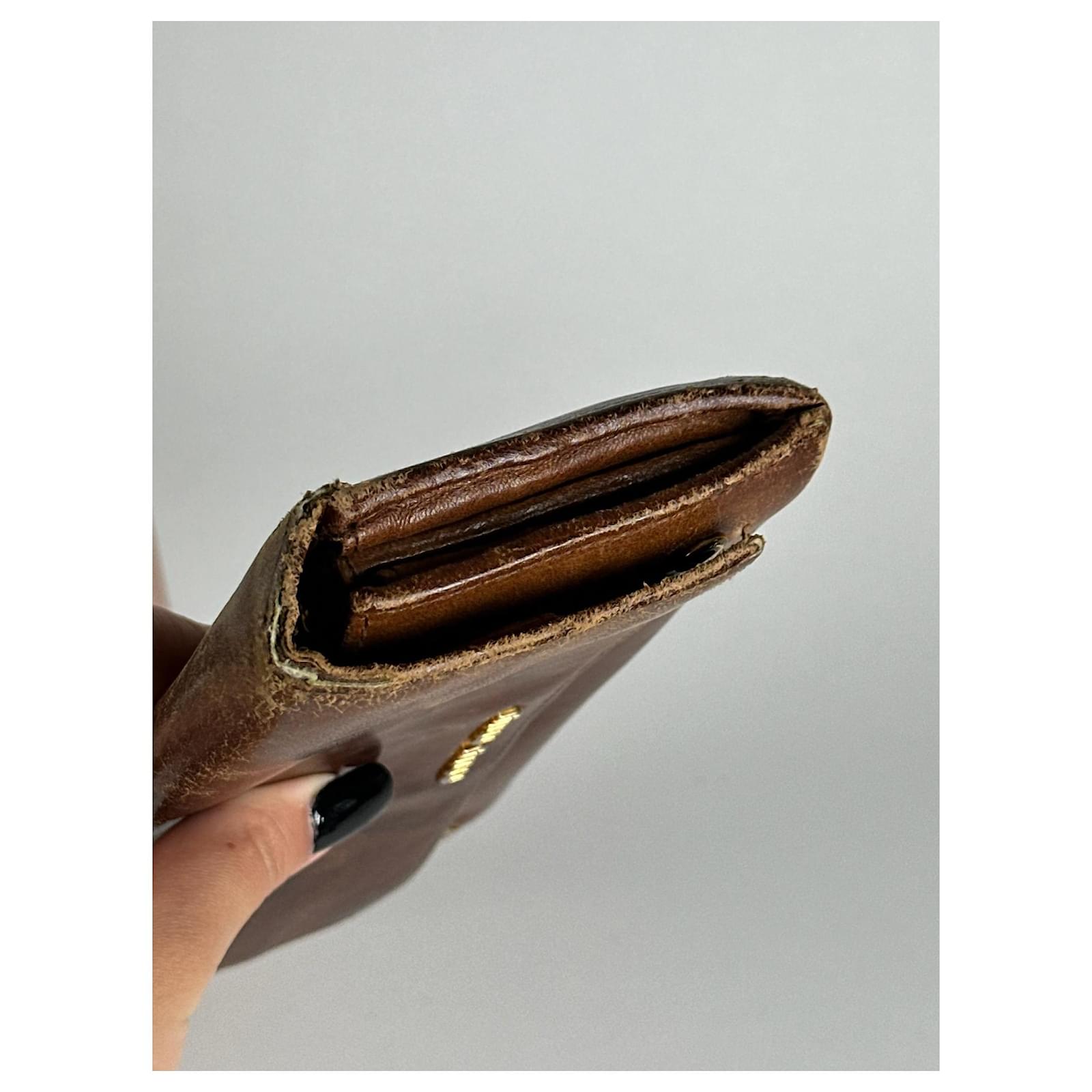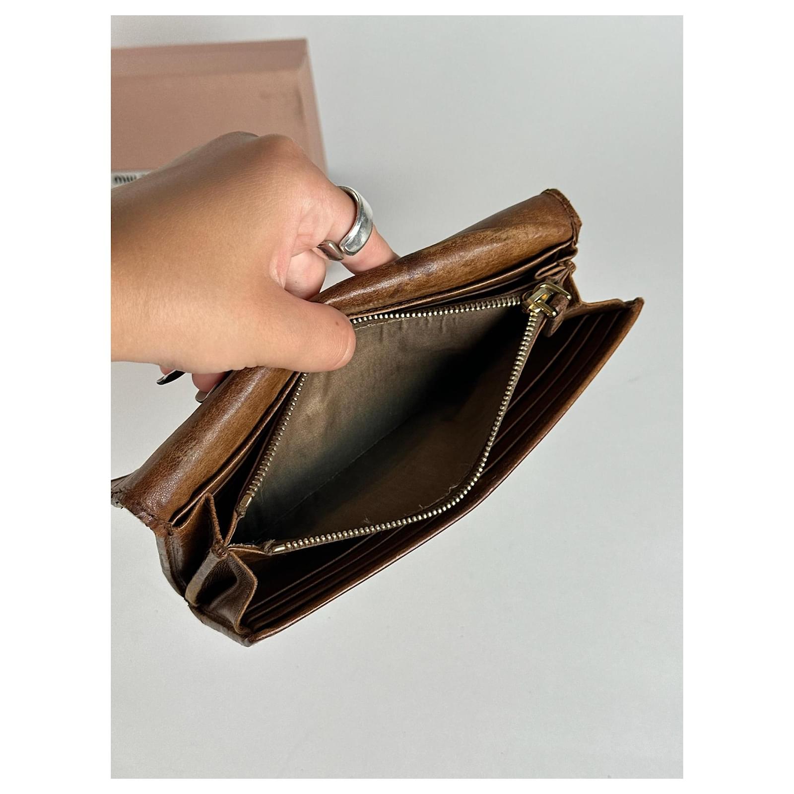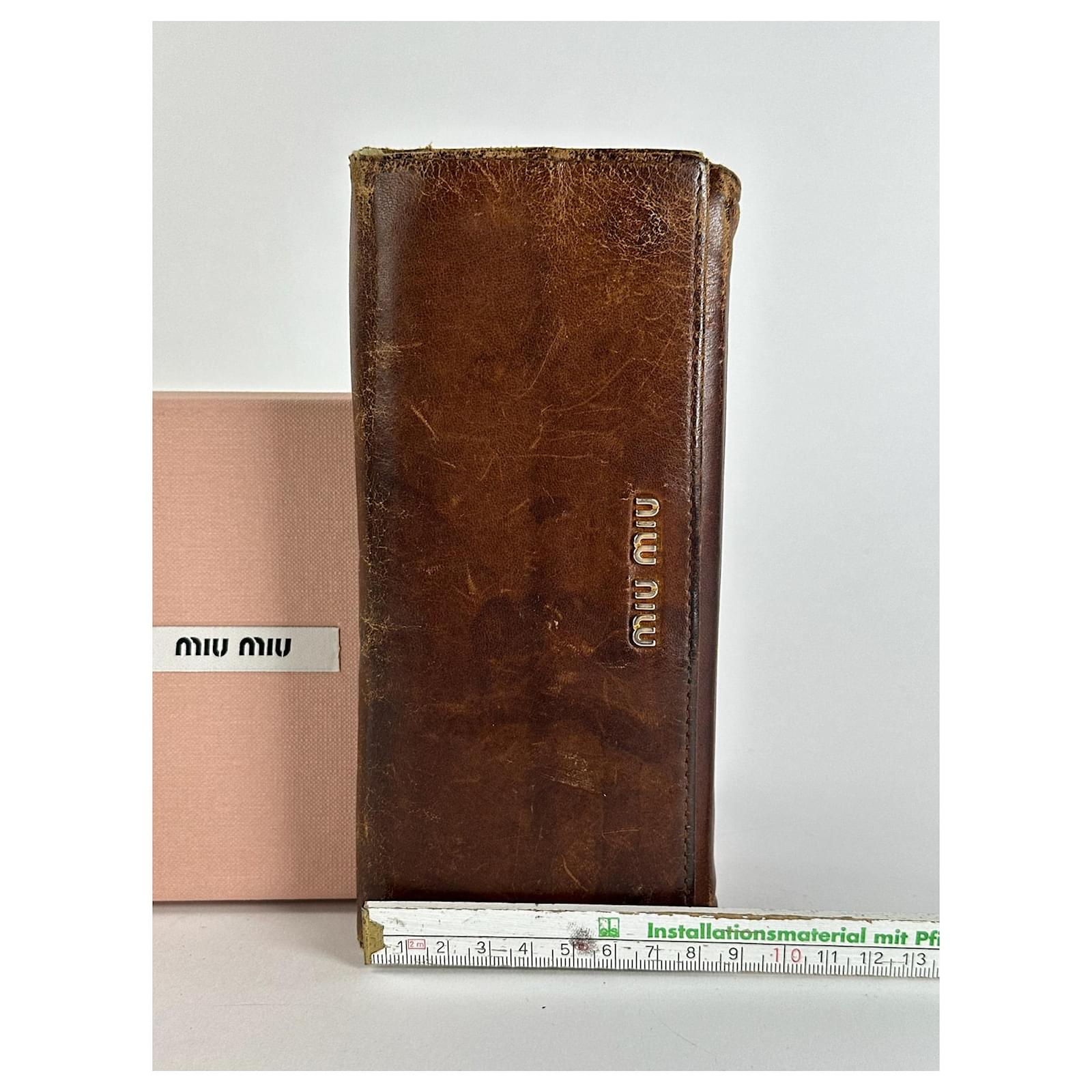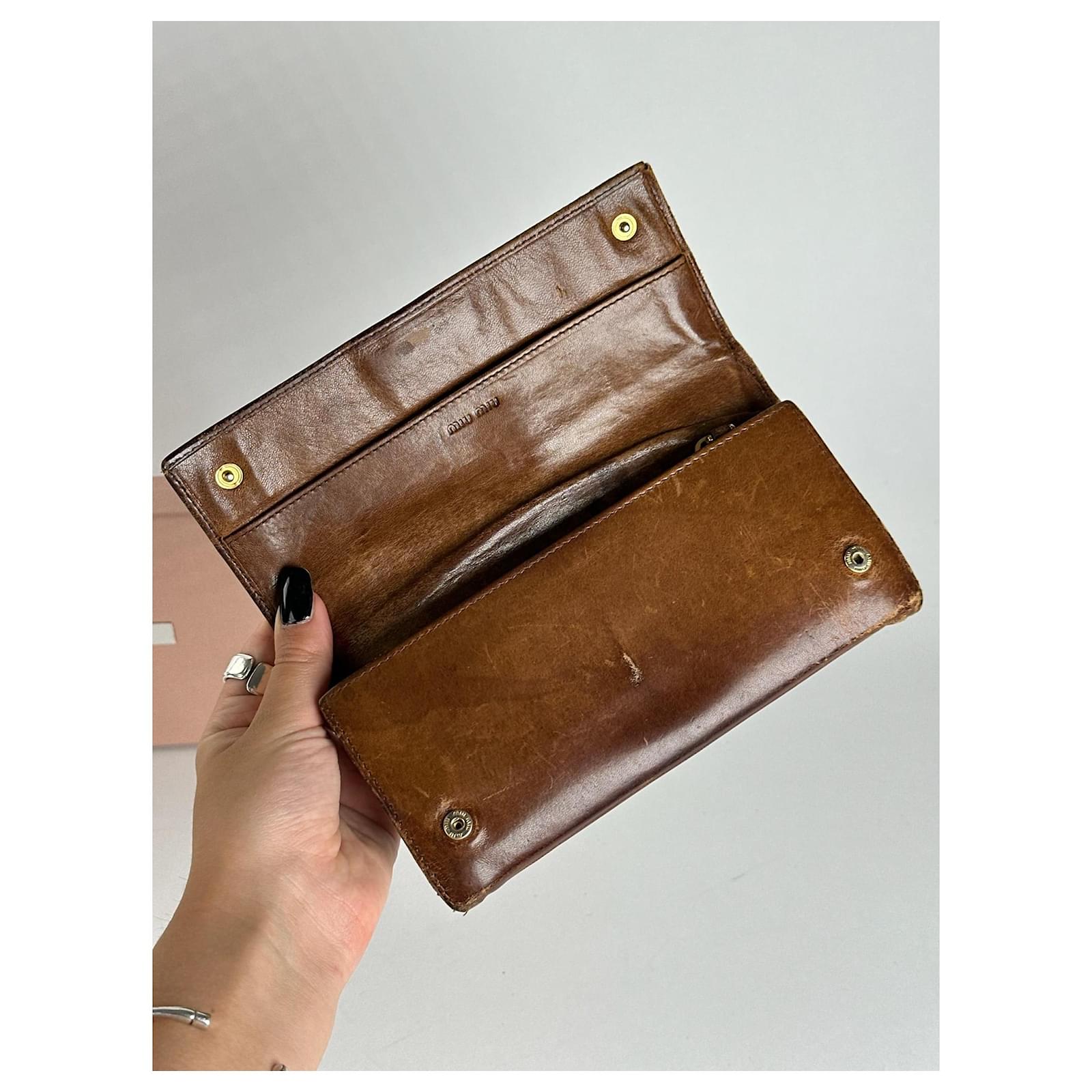 MIU MIU Vintage Leather Wallet.\nThis vintage wallet is finely crafted of brown leather with brown canvas\ntrimming and features snap button closures. The iconic Miu Miu logo in gold-tone\nsteel is displayed on the front.\nBrand: MIU MIU\nModel: Vintage Leather Wallet\nCondition: Very Good\nCondition Details: The exterior leather shows light scratches but remains in\nvery good condition. The gold-tone steel hardware is well-preserved with minimal\nsigns of wear.\nMain Color: Brown\nInterior Color: Brown\nHardware Color: Gold\nMaterial: Leather, Canvas\nComes With: Miu Miu box\nWidth: 19 cm\nHeight: 8.5 cm