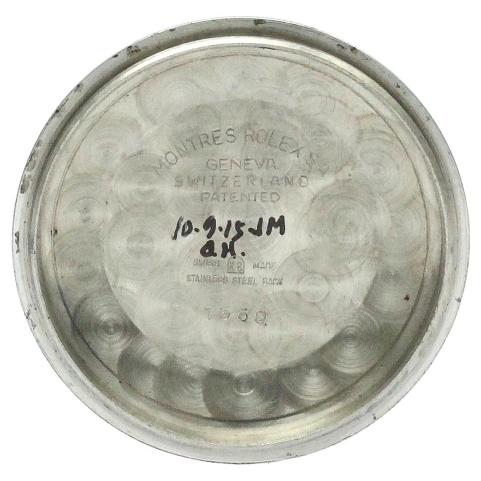 This vintage Rolex Oyster Perpetual Date 1550 wristwatch features a silver dial and is crafted with a gold-plated case, making it suitable for dress and formal occasions. The watch is powered by a self-winding automatic movement and has a case diameter of 34mm. The leather band accommodates wrist sizes between 15cm and 19cm. \n\nIn terms of condition, the watch is classified as used but remains in good shape, with insignificant hand scratches and slight wear on the case, bezel, and crown. The band and pin buckle are aftermarket replacements. The watch includes a date function and has a total weight of 50g. \n\nThis model, identified by the code 1550, is a notable piece for collectors and enthusiasts alike.