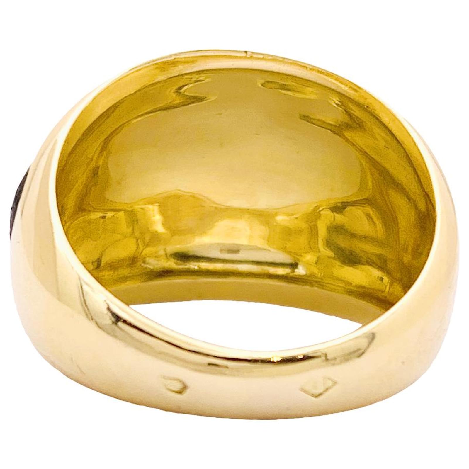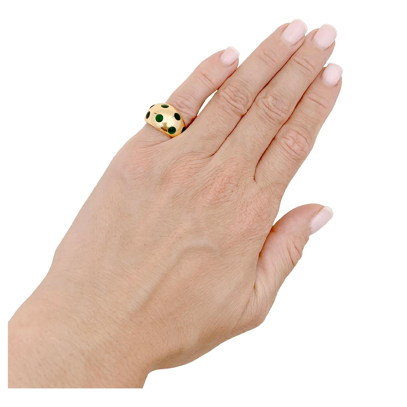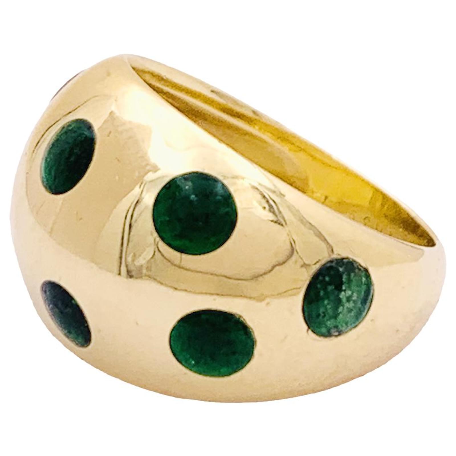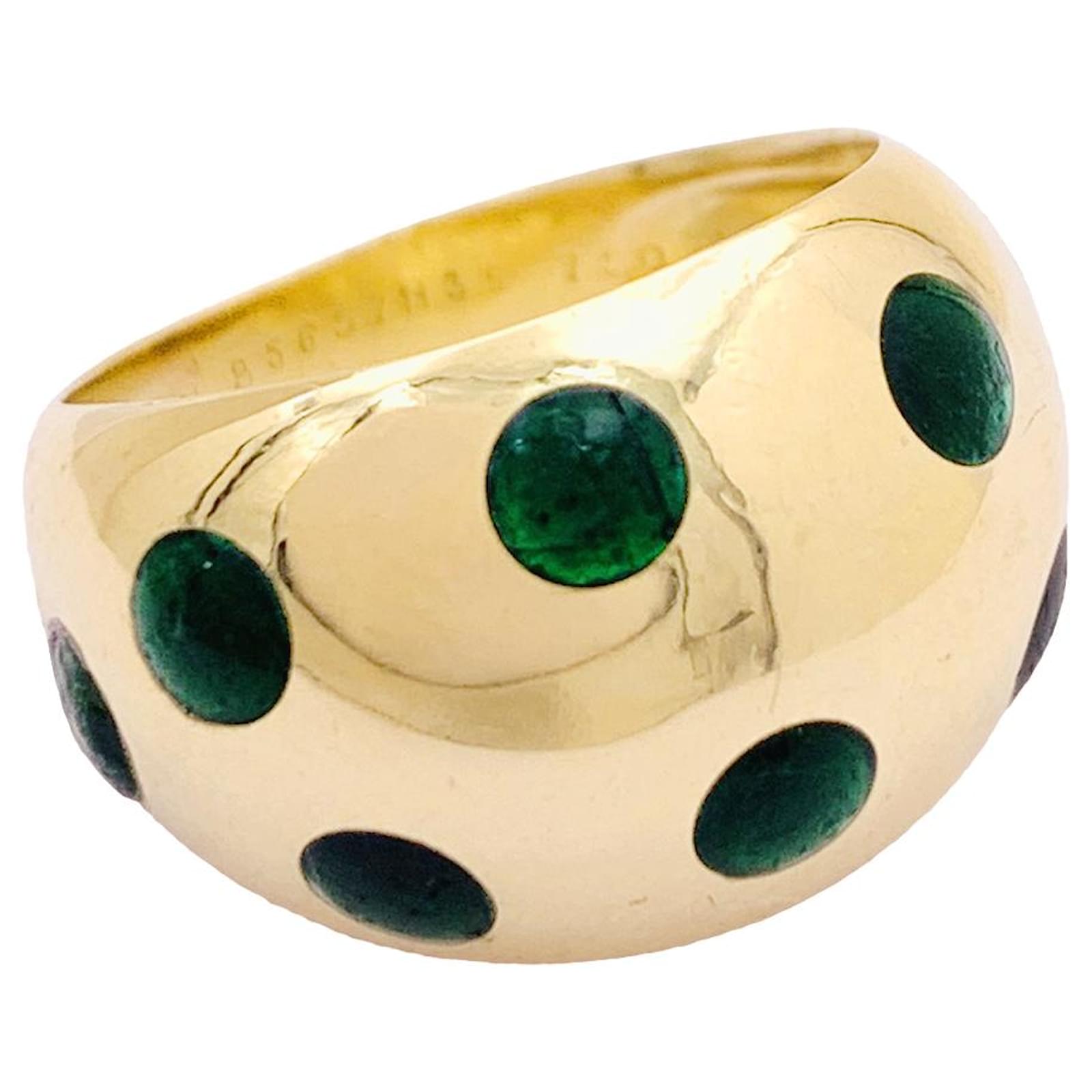 A ball ring signed by the House of Van Cleef & Arpels in 18k yellow gold punctuated with round motifs in green lacquer.\nRing size: 47