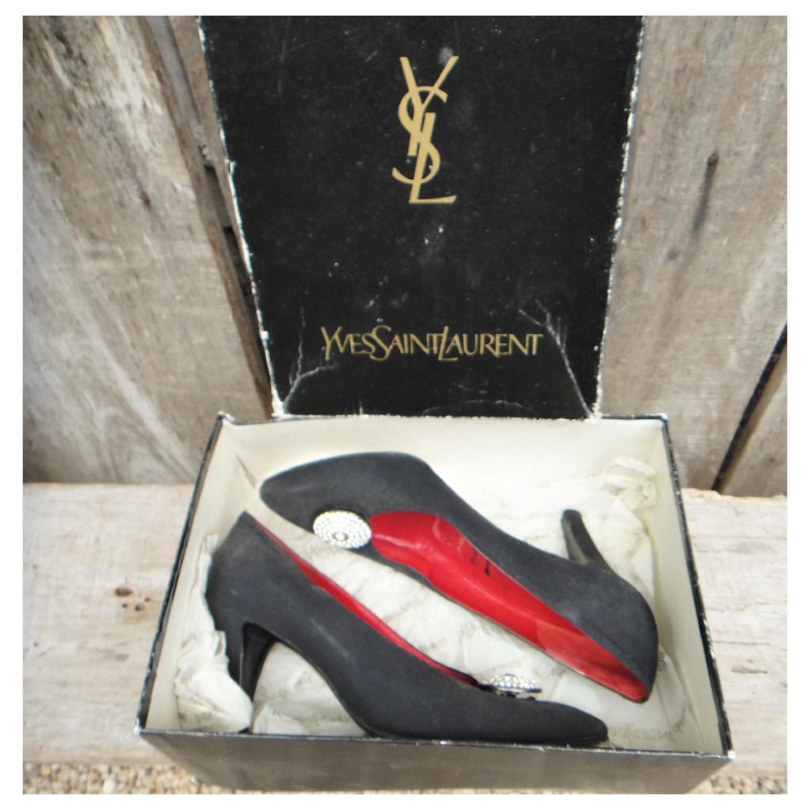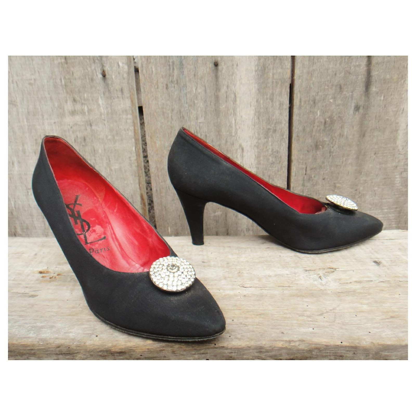 – Yves Saint Laurent pumps\r\n- vintage circa 1975\r\n- shoe size 37\r\n- immaculate condition, they obviously had very little use\r\n- sold in their box\r\n- satin-covered leather upper with rhinestone jewel, first leather, leather sole\r\n- heels of 8 cm\r\n- Made in Italy\r\n- a clean line, a flash of rhinestones on a black background, and the magic of Saint Laurent\r\n2208050