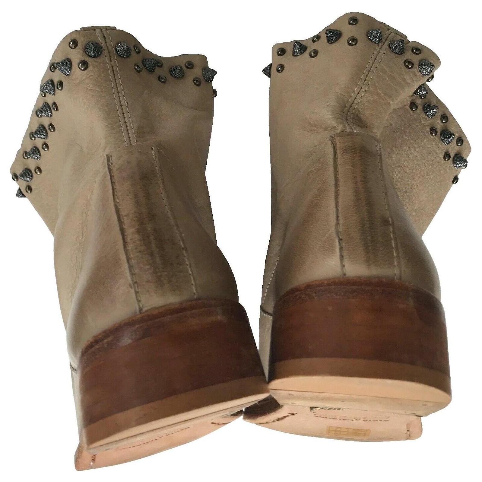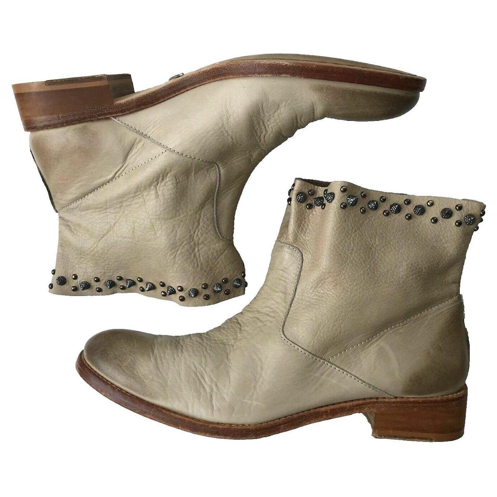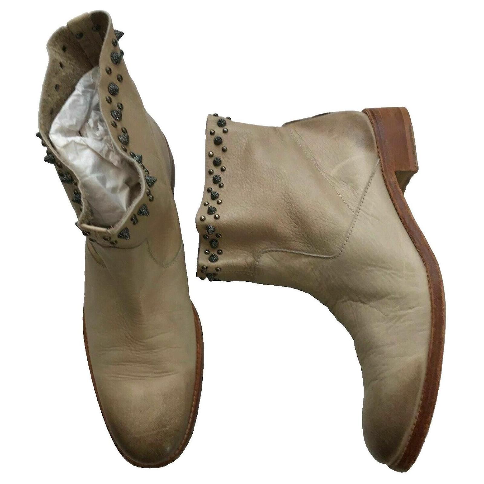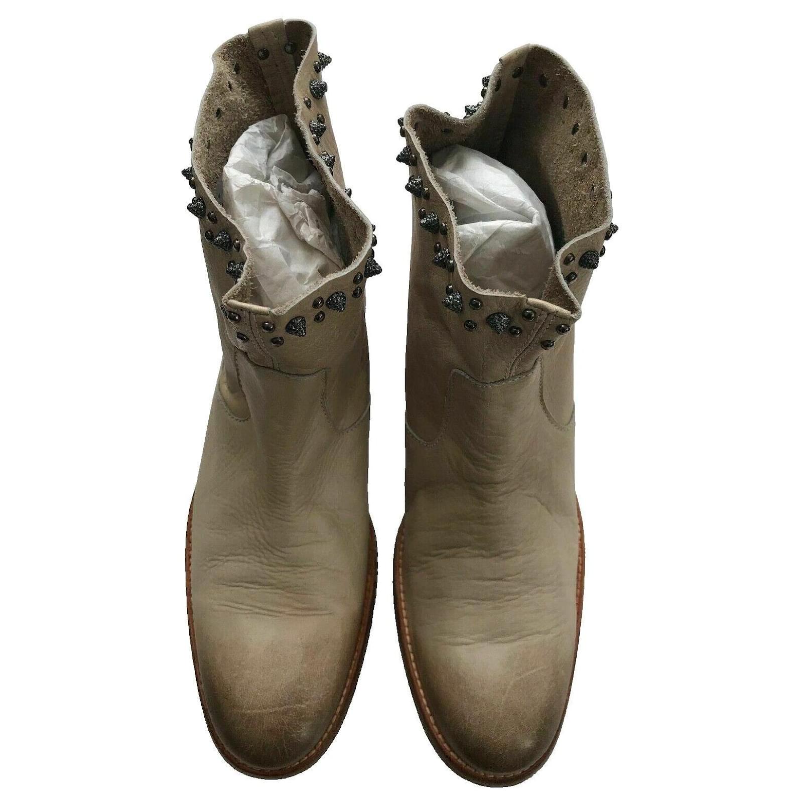 Take a trip to the wild west with these chic cowboy boots. Designed in a beige leather, these boots features an ombre effect toe, deliberate aged leather, round toe, wood effect block heel, and spike stud detailing at the top. Stunning Boots!\r\n\r\nSize 39, UK6, Insole 26cm, Outsole 28cm\r\nAlmond toe\r\nOmbre effect toe\r\nDeliberate Aged leather \r\nZV rivet metallic wings on the bottom soles \r\nStandout spike studs around top edges of boots \r\nUpper Leather, Inner Leather, Sole Leather\r\nHeel Height 1.25inch or 3cm\r\nBoot Shaft Height – 5 inches or 12.5cm\r\nCalf Circumference – 15 inches or 38cm \r\nRRP£425 \r\nMade in Spain \r\nBox and Dust Bag