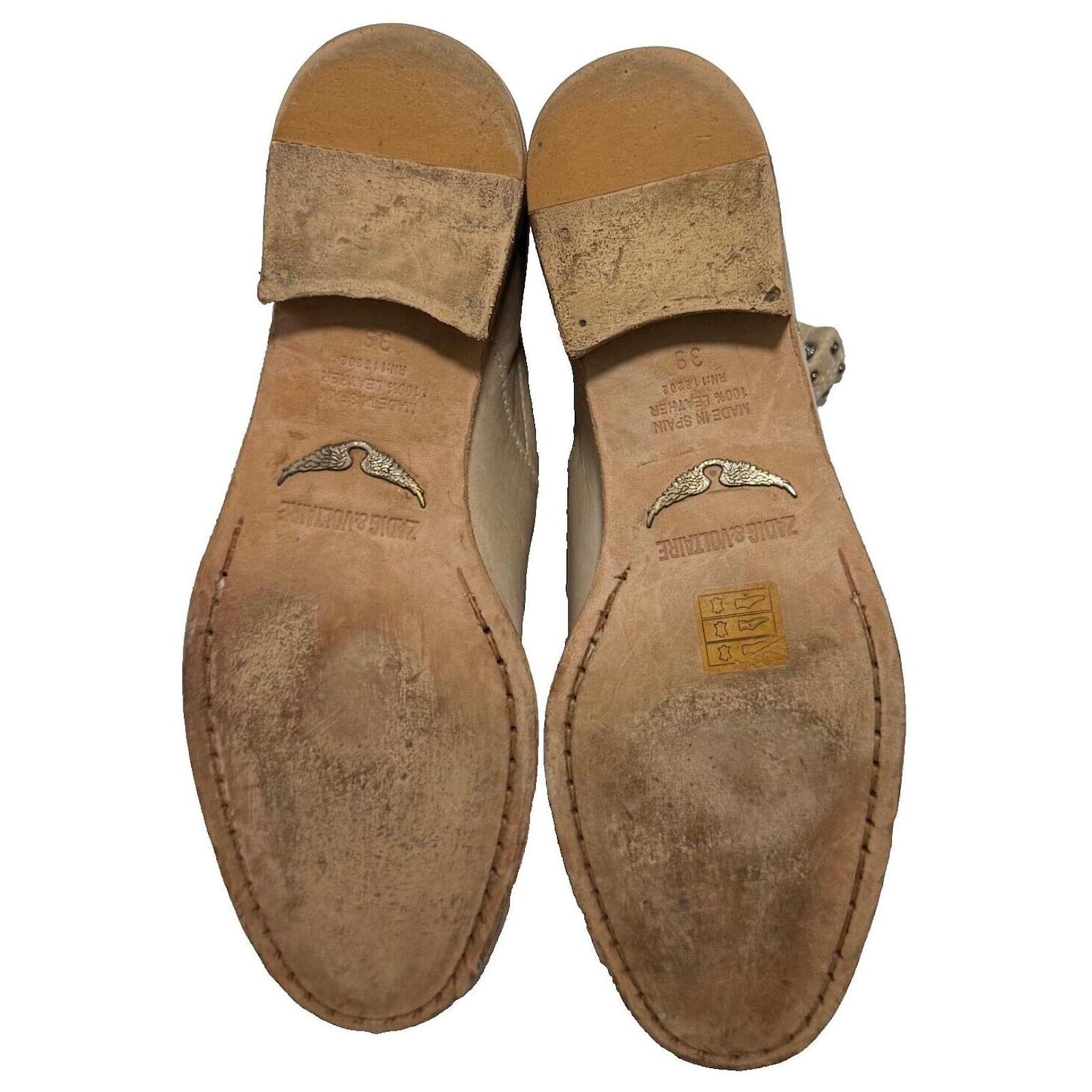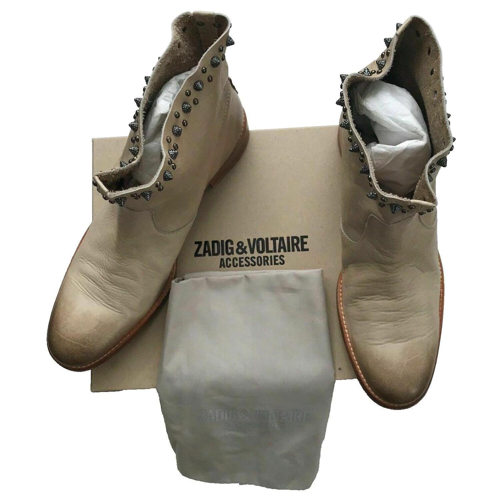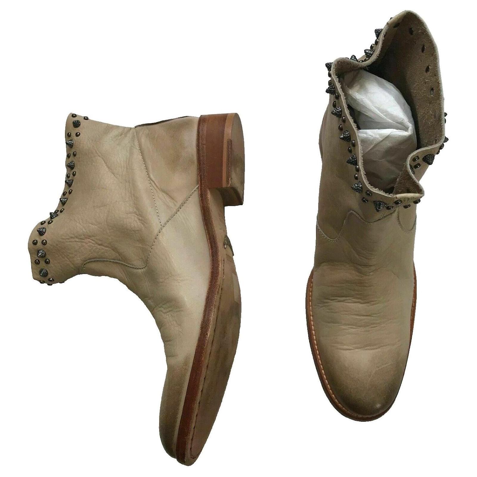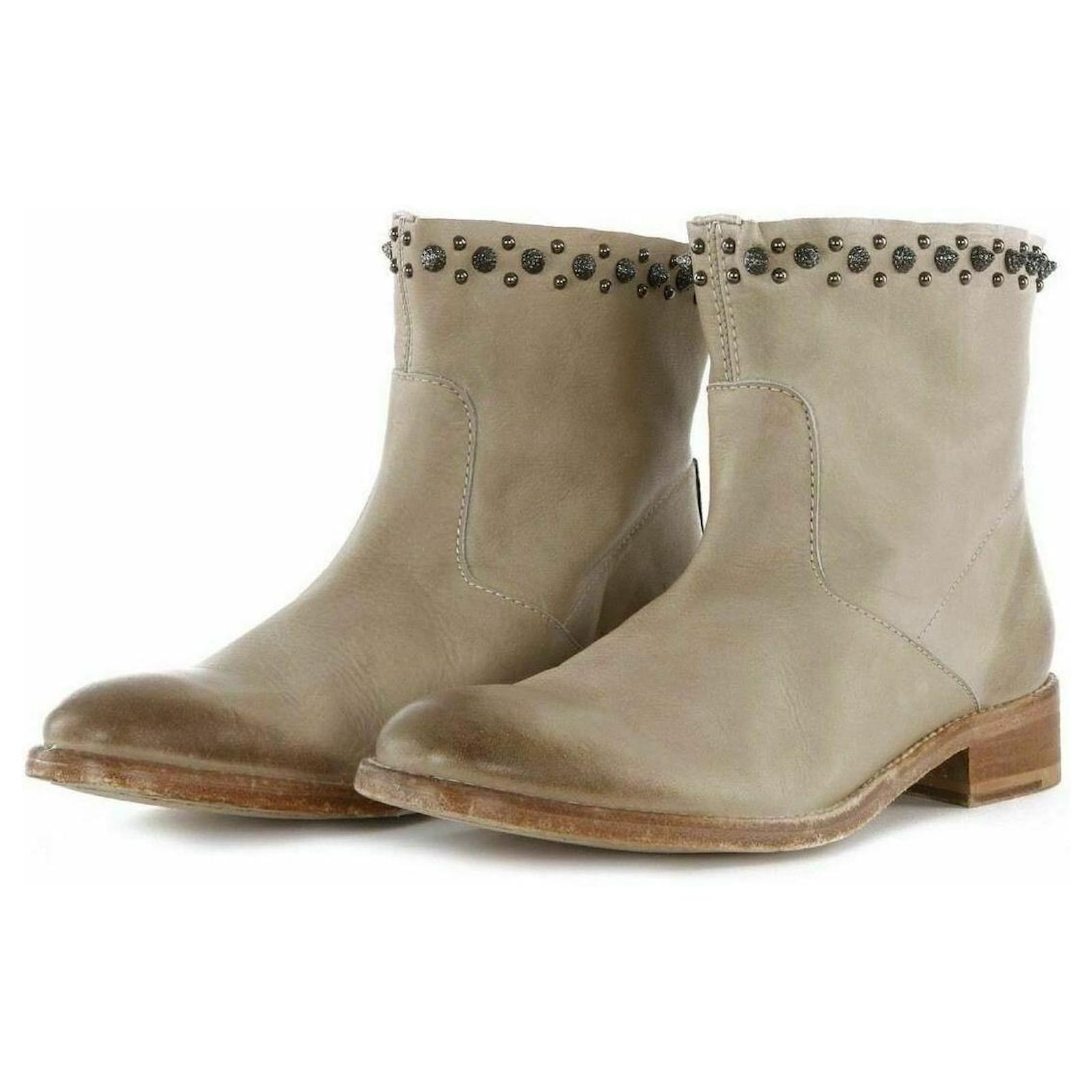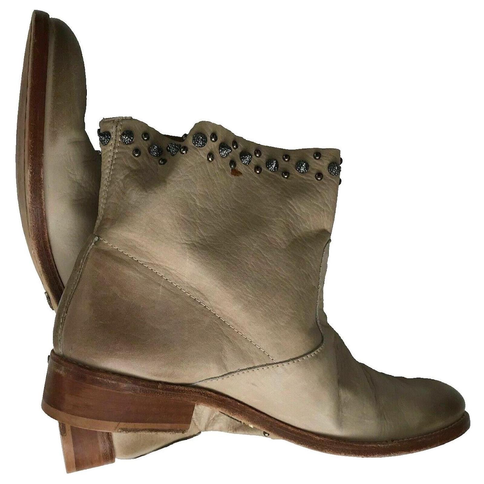 Take a trip to the wild west with these chic cowboy boots. Designed in a beige leather, these boots features an ombre effect toe, deliberate aged leather, round toe, wood effect block heel, and spike stud detailing at the top. Stunning Boots!\r\n\r\nSize 39, UK6, Insole 26cm, Outsole 28cm\r\nAlmond toe\r\nOmbre effect toe\r\nDeliberate Aged leather \r\nZV rivet metallic wings on the bottom soles \r\nStandout spike studs around top edges of boots \r\nUpper Leather, Inner Leather, Sole Leather\r\nHeel Height 1.25inch or 3cm\r\nBoot Shaft Height – 5 inches or 12.5cm\r\nCalf Circumference – 15 inches or 38cm \r\nRRP£425 \r\nMade in Spain \r\nBox and Dust Bag